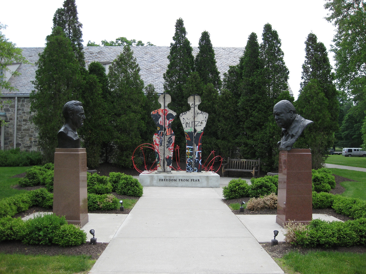 박물관 뒤 뜰에 보면 흉상 조형물이 서로 마주 보고 있습니다. 왼쪽이 루스벨트 대통령 오른쪽이 처칠 수상입니다. 2차 세계대전을 이끈 연합국의 리더죠. 지금도 서로 마주 보면서 의견을 주고받는 것 같습니다.