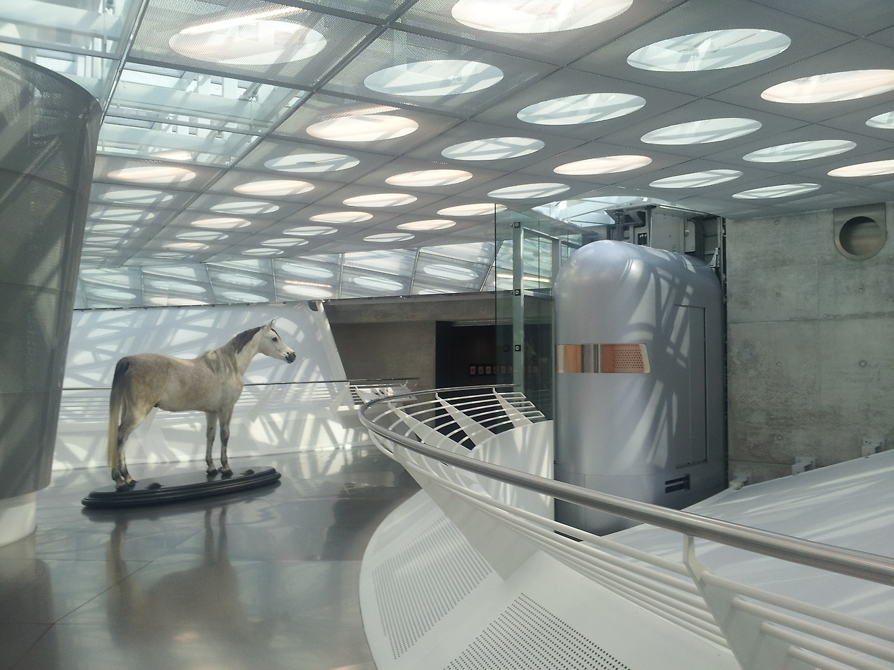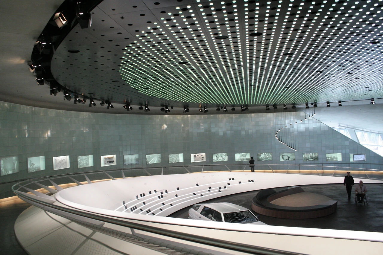 벤츠 박물관은 맺 위층부터 아래로 내려오는 동선구조입니다. 커다란 원형 슬로프를 타고 내려오는 동선인데 중앙 부분이 오픈되어 있는 곳이 있어 공간의 웅장함이 한 것 도들어 보이곤 합니다.