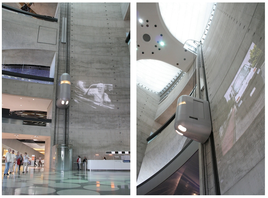 박물관 홀입니다. 전시 관람 순서가 맨 위층부터 내부 슬로프를 타고 내려오는 구조인데, 맨 위층까지 올라가는 엘리베이터가 아주 독특합니다. 아래 사진 보시면 이해가 되시겠네요.