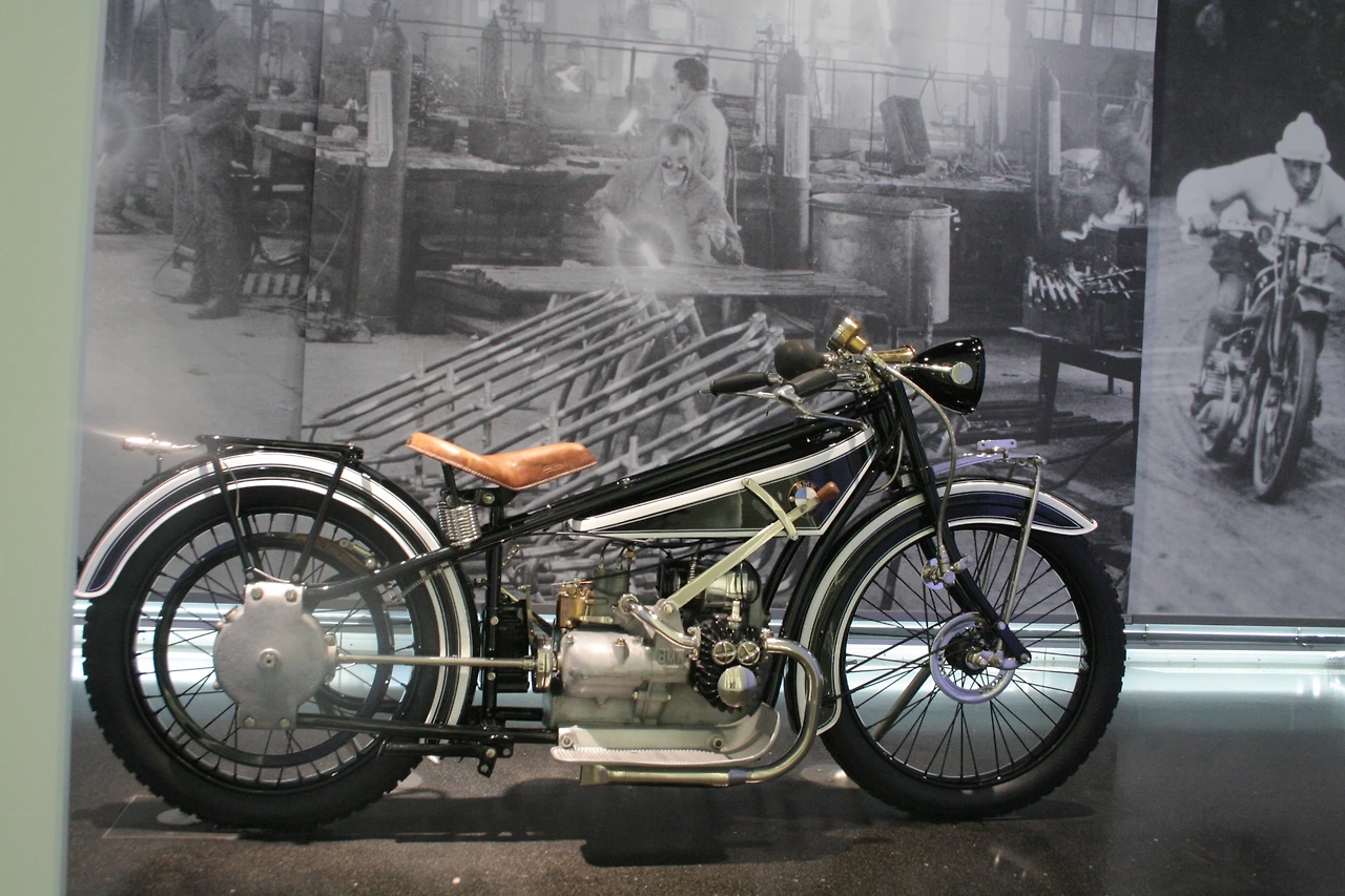 1차 세계대전, 2차 세계대전의 패전국이지만 BMW를 다시금 도약하게 만든 콘텐츠는 오토바이였다고 합니다. 그래서 박물관 초기 도입부에 오토바이가 전시되어 있습니다. 역시나 배경 그래픽을 보면 어떤 시대적 배경인지 느끼게 됩니다.