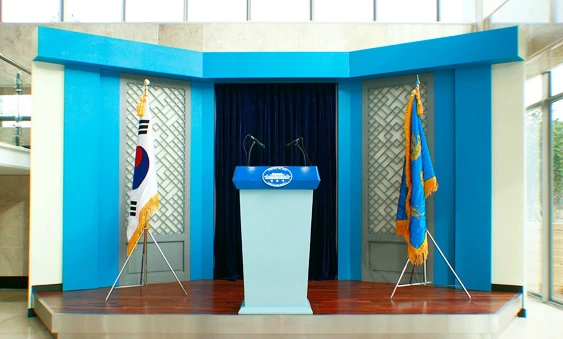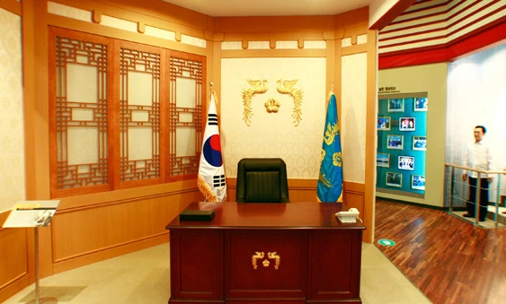 셋째. 포토존. 관람객들이 사진을 찍을 수 있도록 로비에 청와대 기자회견장, 대통령 집무실, APEC 정상들과 기념 촬영할 수 있는 포토존 공간이 조성되어 있습니다.