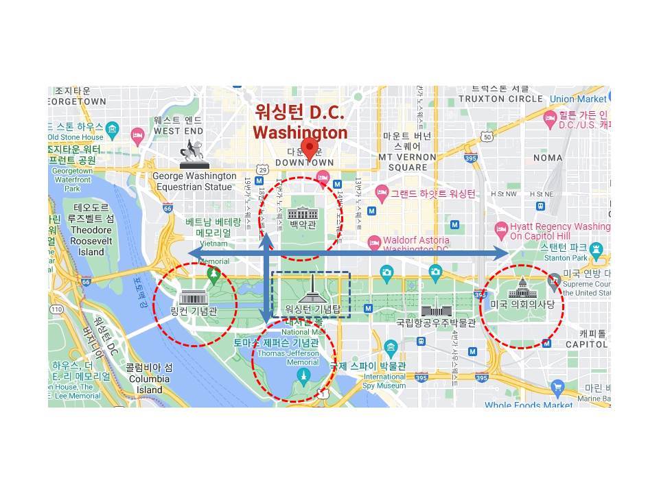 처음부터 이야기가 샛길로 갔지만, 계획도시 워싱턴은 중앙에 상징조형물 '워싱턴 탑'을 중심으로 동, 서, 남, 북에 아주 중요한 건축물 4개가 자리하고 있습니다.