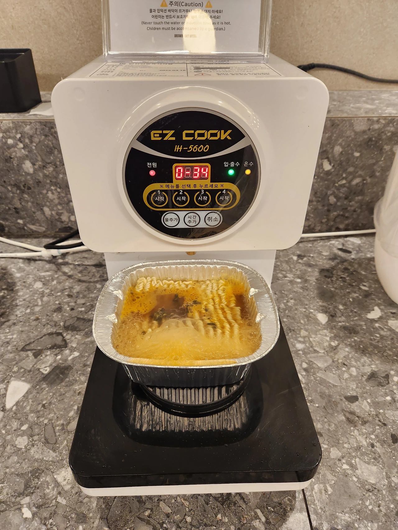 호텔에서의 한강 라면 체험 사진을 나눕니다.