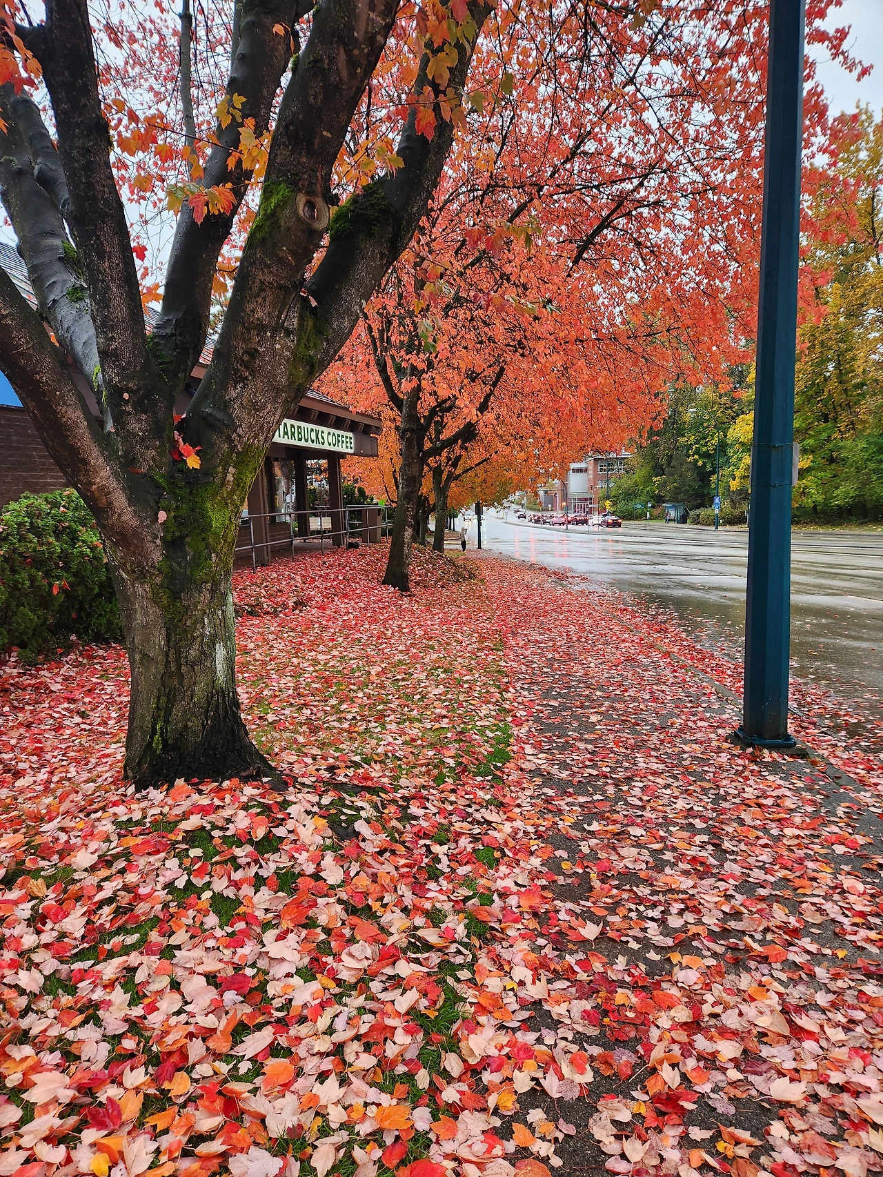 젖은 낙엽이 덮인 늦가을의