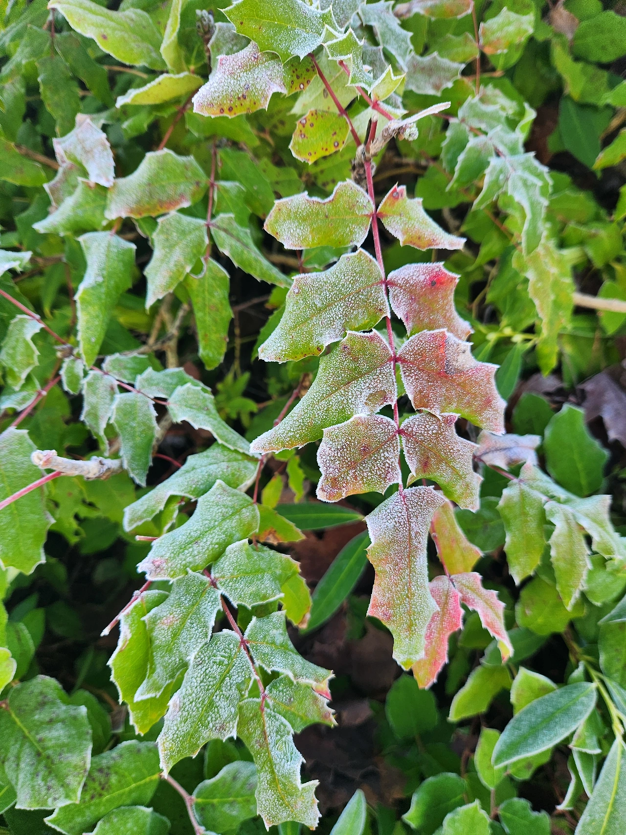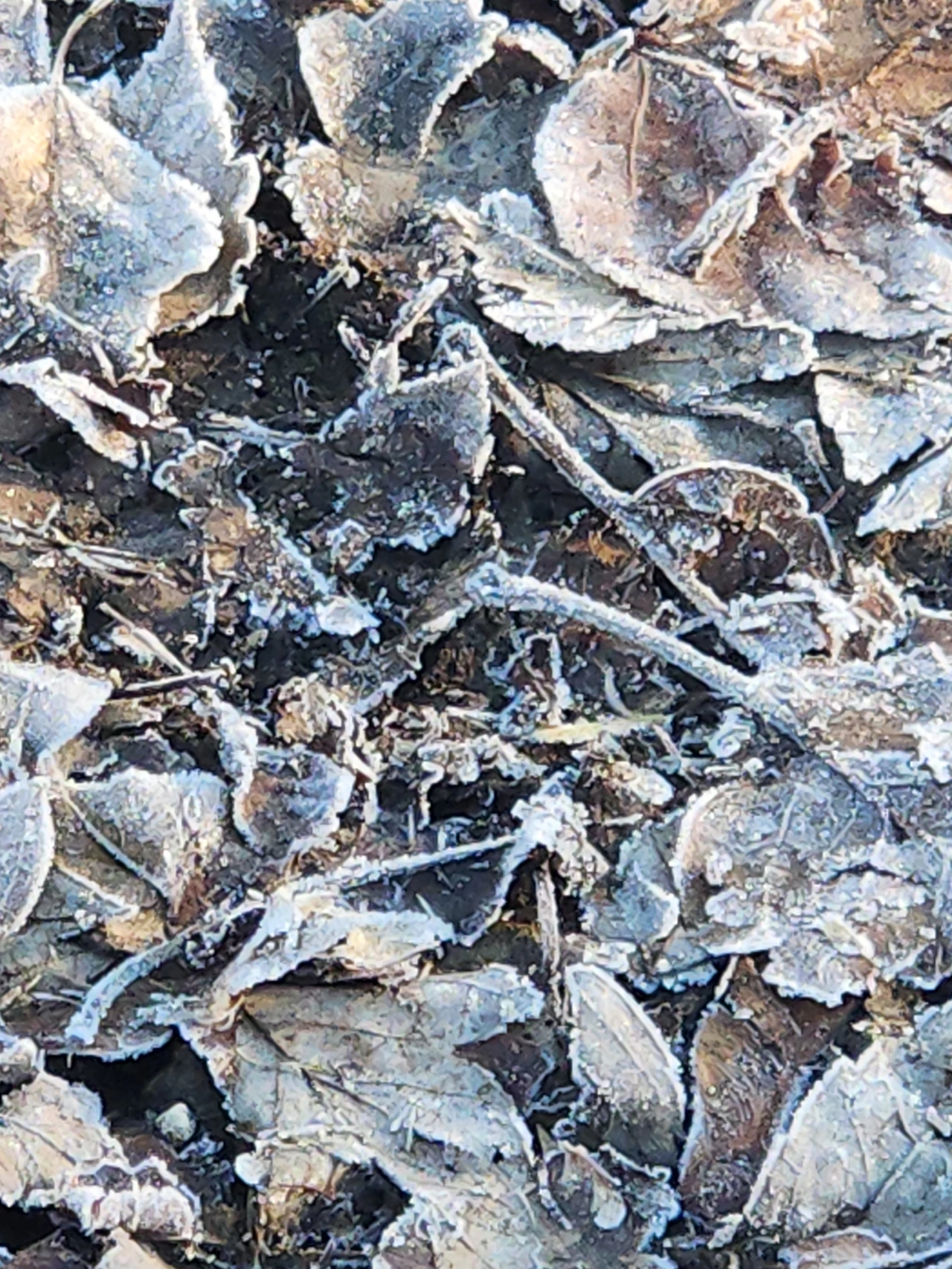 나뭇잎 위에 낀 하얀 성에를 보며