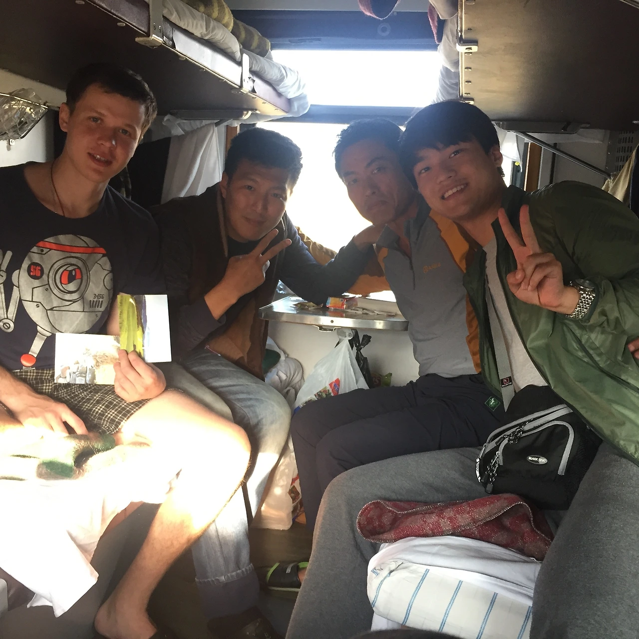 우리가 타고 있는 열차의 차량은 6인용 칸막이로 개조한 차량으로서 차량 창가 쪽에 2m가량의 침대 겸 의자를 2층으로 붙여 놨고, 통로를 마주하여 침대 넓이의 공간 중앙에 차나 책을 볼 수 있는 조그만 테이블이 있고 양쪽으로 2층 침대가 서로 마주하고 있다. 그 6명이 낮에는 공용으로 이용하는 테이블에서 낯선 사람들과 차도 마시고 이야기를 하며 장기간의 무료한 시간을 보낸다.