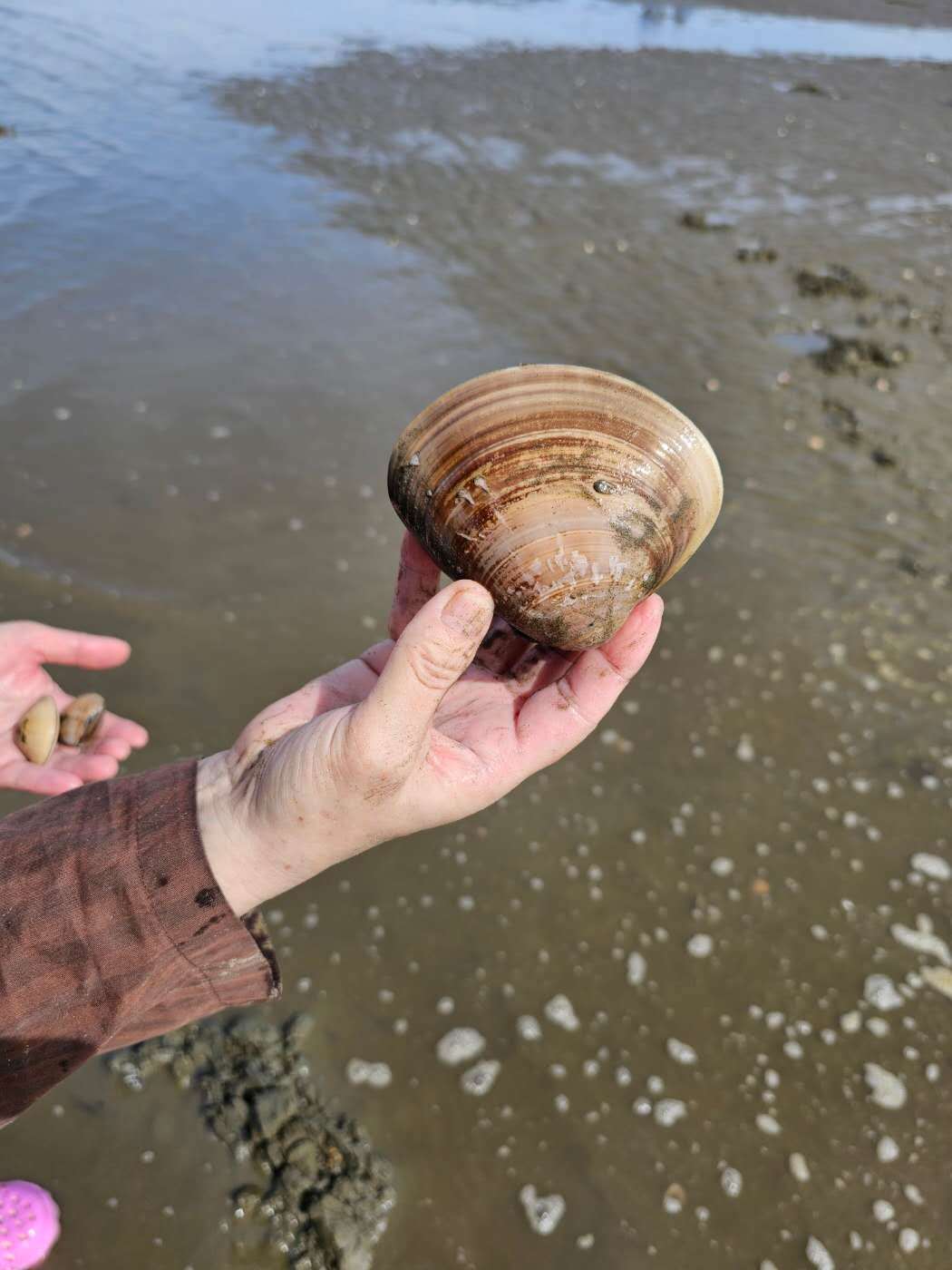 그러다 ‘딱’ 긁히는 느낌과 함께 커다란 백합조개 하나가 손에 들어왔다.