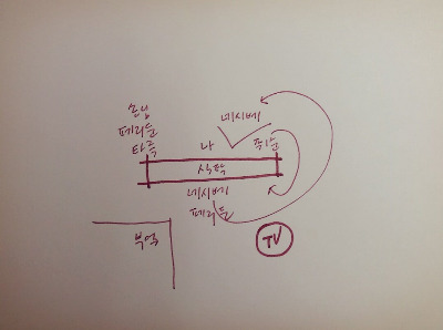 꽤 오래전에 상당히 재미있게 읽은 오르한 파묵의 소설 <순수박물관>의 문장이다. 오르한 파묵은 책 속 화자인 케말이 퓌순을 만나고 사랑하는 과정을 두꺼운 두 권의 책에 담았는데, 그 감정의 디테일에 놀라워하며 읽었다. 아래 묘사는 식탁 주변에 앉는 위치가 잘 파악되지 않아 그려가면서 읽은 부분이다. 퓌순이 맞은편에 보이도록 앉게 되면 마음이 힘들어진다는 표현이다.ㅎ