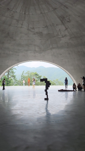 엇, 이곳은 새로운 공간이다. 동굴구조로 천정이 돔으로 되어 역시 원형으로 조그맣게 뚫려있다. 눈이나 비가 올 때는 어떻게 되는 건지 궁금하다. 창이 있어 투명해 보이는 듯도 하다. 밖으로 산의 풍경과 이어진다. 말을 하면 울림이 커 강제로 조용히 있어야 한다. 명상의 공간이다. 드문드문 안토니 곰리의 조각 작품이 인간의 형상을 하고 포즈를 취하고 있다. 재료가 벽돌같이 보였는데 산화된 철이라고 한다. 새로운 공간과 예술이 새로운 감각과 사고로 이어진다. 누워있기도 하고 웅크려 있기도 하고 산을 바라보고 있기도 한 작품들 사이로 누가 조각인지 누가 사람인지 모르게 전시를 보는 사람들이 뒤섞여 공간이 만들어진다. 사람들이 조각 옆에 가서 똑같은 포즈를 취하는 것을 보는 것도 재미있다. 새롭게 조성된 공간 안에 전시를 관람하는 사람들까지도 예술의 일부가 된 듯하다. 오랜만에 완전히 몰입하는 전시를 본다. 흔하게 접할 수 없는 조각가의 전시에 이렇게 매료되다니. 경탄한다. 훌륭한 건축가의 공간이 그 아름다움을 배가시킨다. 감사하다. 전시를 보고 돌아와 안토니 곰리에 대해서 찾아본다. 홈페이지에서 작가의 여러 다른 작품들을 본다. 모니터가 뮤지엄이 된다. 전 세계에 안토니 곰리의 작품들이 설치되어 있다. 인간의 신체와 공간 사이의 관계를 탐구하는 조각, 설치, 공공미술 작품들이 나를 새로움으로 이끈다. 한 명의 예술가를 알게 되었고 내가 이 자연과 우주 안 어디에 존재하는지 사유하는 시간을 갖는다. 조카와 점심을 먹고 어떤 전시를 보러 갈까 이야기하다가 순간적으로 결정했던 강원도 원주의 뮤지엄 산에서 뜻밖의 큰 영감을 받는다!