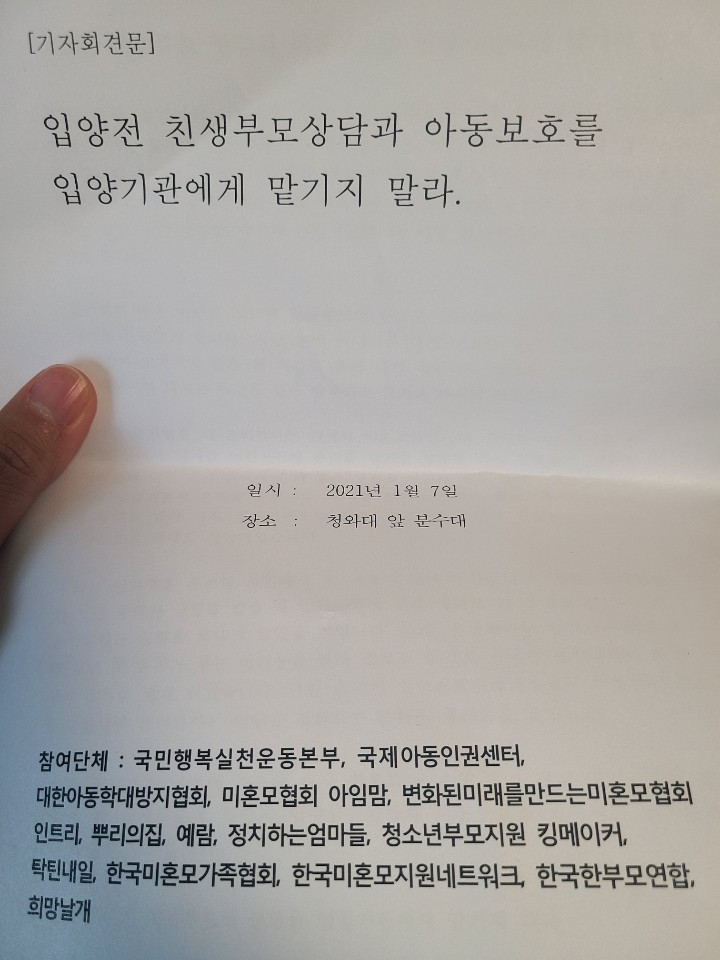 18일 청와대 앞 기자회견에서 김도현 뿌리의집 목사님이 절규했다. 내가 "오늘 청와대가 아동 학대에 대해 어떤 언급을 해야 했다고 생각하십니까?"라고 질문한 뒤다. "문 대통령이 신년 기자 회견에서 '입양 후 아이가 맞지 않으면 반품(?)을 할 수 있게 해야 한다'는 취지의 아주 부적절한 말을 했다"고 참석자들 여럿이 강한 비판을 한 직후였다. 이 회견에는 대한아동학대방지협회, 미혼모협회 아임맘, 국제아동인권센터, 뿌리의집 등 여러 단체가 참여했다.