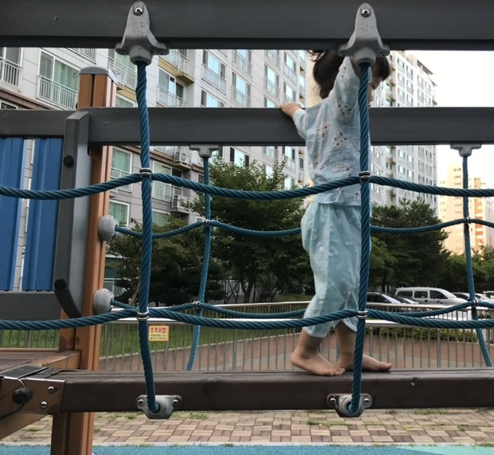 번개가 놀이터 외나무다리에서 넘어졌습니다. 제가 번개에게 멀리 떨어진 쪽에서 천둥이가 올라가는 것을 도와주고 있었는데, 번개는 그만 넘어졌습니다. 서둘러 천둥이를 바닥에 내려놓고 번개에게 갔지만, 그 사이에 번개는 작은 몸을 일으켜 안전한 곳으로 이동했습니다. 외나무다리에서 두 다리가 잘못 빠지면 바닥에 그대로 떨어집니다. 다행히 오늘 아이는 넘어질 때 다리가 외나무다리 양 옆으로 하나씩 빠져서 바닥에 떨어지는 일을 피했습니다. 저는 놀란 아이를 꼭 안아 다독여주었습니다. 그리고 괜찮아지면 내려주겠다고 했더니, 아이가 잠시 후에 바닥에 내려달라는 듯 손짓합니다.