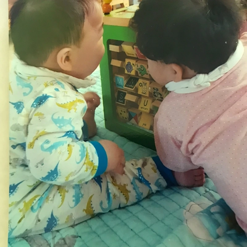쌍둥이 엄마로서 쪼꼬미들이 동시에 울 때 크게 난감했습니다. 한 명을 둥가둥가하면서도, 연신 울고 있는 다른 아이를 신경쓰느라 불편한 마음을 경험했습니다. '쌍둥이 육아를 어떻게 잘 할 수 있을까? 나는 잘 하고 있는 걸까?'라는 물음표가 제 마음에 수없이 나타났다가 사라지곤 했습니다. 아이들 욕구를 모두 만족시킬 생각은 없었습니다만, 그저 아이들에게 좌절감을 과도하게 안기고 있지 않을지 염려하곤 했습니다. 아이들이 기어다니기 시작하면서 붙잡고 밀고 당기며 다투기 시작하자, 또다른 걱정이 스물스물 올라오기 시작했습니다. '우리 아이들이 서로 사이 좋게 지낼 수 있을까? 언제쯤이나 안 싸우는 걸까?' 그런데 어느 날 부엌일을 하다가 거실에서 노는 천둥번개를 봤는데, 마주보고 웃고 있는 게 아닙니까. 운좋게 그 순간을 사진으로 담아냈습니다. 몇 달 후 그 날 찍은 사진을 컴퓨터 배경화면으로 설정하여, 가까이 두고 보기 시작했습니다. 천둥번개가 서로 웃고 있는 사진을 바라볼 때면, 제 마음이 따뜻해지고 미소가 은은하게 번졌습니다.