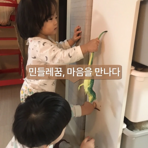 21개월 천둥번개는 예상하지 못한 지점에서 기쁨을 선물합니다. 아이들이 등원하고 나서 집을 정리하다가 발견했습니다. 도마뱀 두 마리가 장난감 보관함 벽면에 거꾸로 매달려 있습니다. 아이들이 장난감 보관함에 있는 작은 구멍에 도마뱀 꼬리를 끼워놓았습니다. 웃음이 나서 한참을 들여다보고 웃고 했습니다.