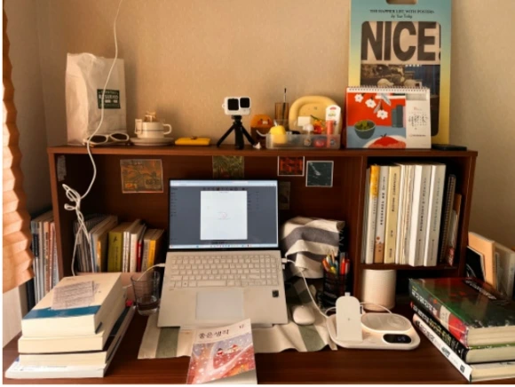 책상 내부로 들어오면 왼쪽 이케아 핑크 바구니에 담긴 책은 <세이노의 가르침>, <동아시아-대양주 철새이동경로 파트너십- EAAFP 자료>, <복지관사례관리 공부노트>, <좋은생각 10월, 11월, 12월호>, <그대가 곁에 있어도 나는 그대가 그립다 - 류시화>, <공자가 죽어야 나라가 산다-김경일>, <나의 두 번째 이름은 연아입니다.- 신아현>, <회복하는 인간-한강> 책과 서적들이 꽂혀있다.