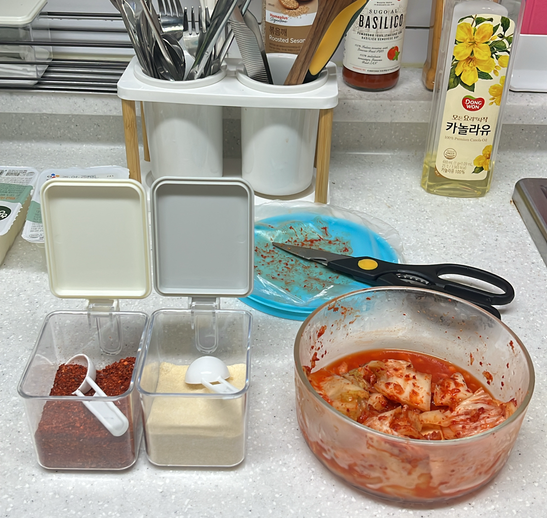 그 위에 고춧가루 이불과 설탕도 뿌려주세요.