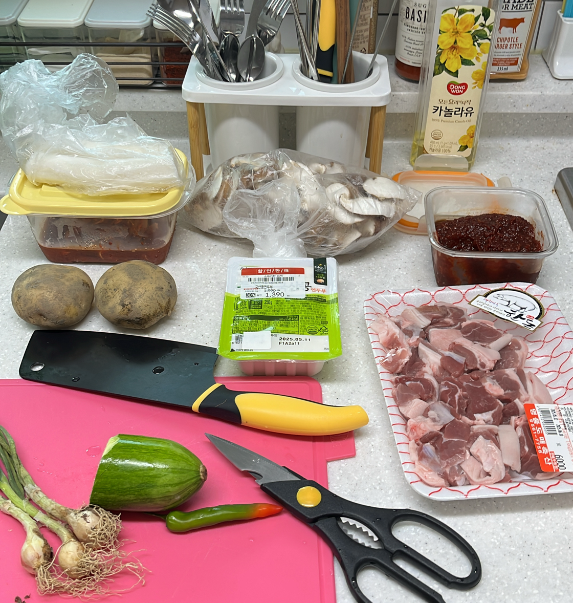 돼지고기두부버섯고추장찌개를 만들어준다.