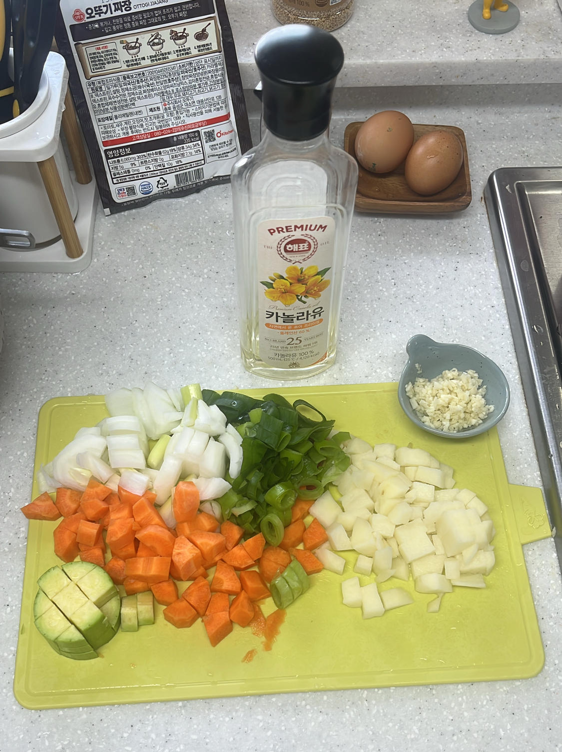 저는 마늘을 볶다가 나머지 야채는 대파 양파 당근 감자 애호박 순서로 때려넣어줬습니다! 퍽퍽 팍팍