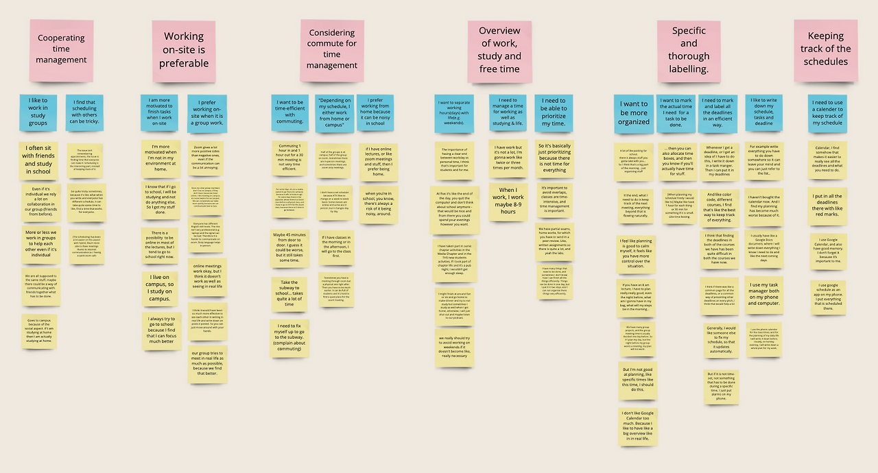 디자인 프로젝트의 두 번째 과정인 “정의하기” 과정은 사실상 “발견” 과정에서 얻은 데이터를 분석하는 것이 가장 중요했다. 우리는 우리가 얻은 여러 데이터를 분석하기 위해 가장 먼저 친화도 다이어그램(Affinity Diagram)을 만들었다. 친화도 다이어 그램은 방대한 정보를 여러 관점으로 뜯어보고 그룹화하는 것인데, 이를 위해 Miro라는 협업 플랫폼을 사용했다.