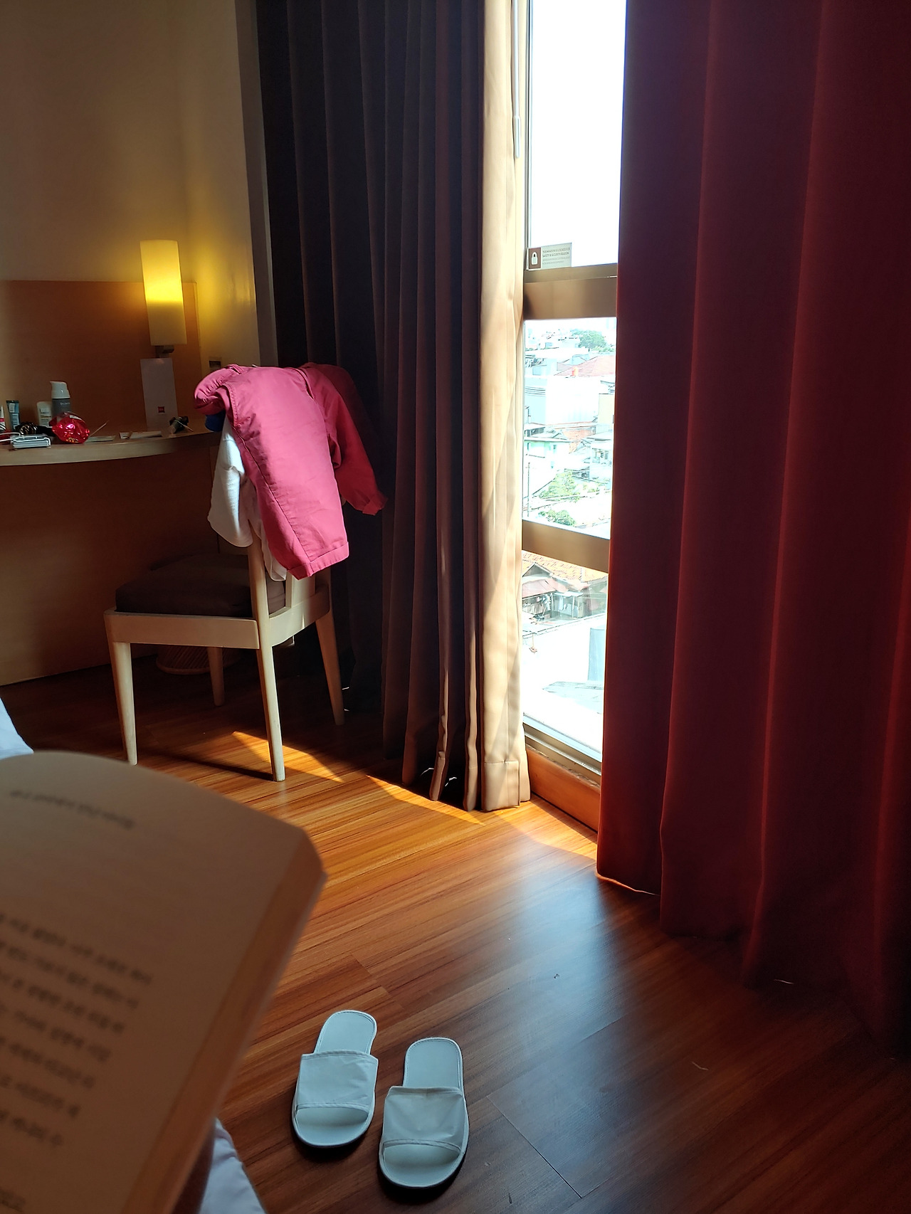 아침을 늦게 먹어서 그런지 화장실 다녀오고 사부작 거리다 티비 보고 조금 뒹굴거리다 보니 벌써 오후가 꽤 지났다. 창이 큰 방을 선택한 탓에 햇볕이 많이 들어 암막 커튼을 완전히 닫고 있었다. 살짝 걷어 밖을 내다 보니 눈이 부실 정도로 밝다. 한 낮의 눈부신 태양이 찬란하게 볕을 내리 쬐고 있었다.