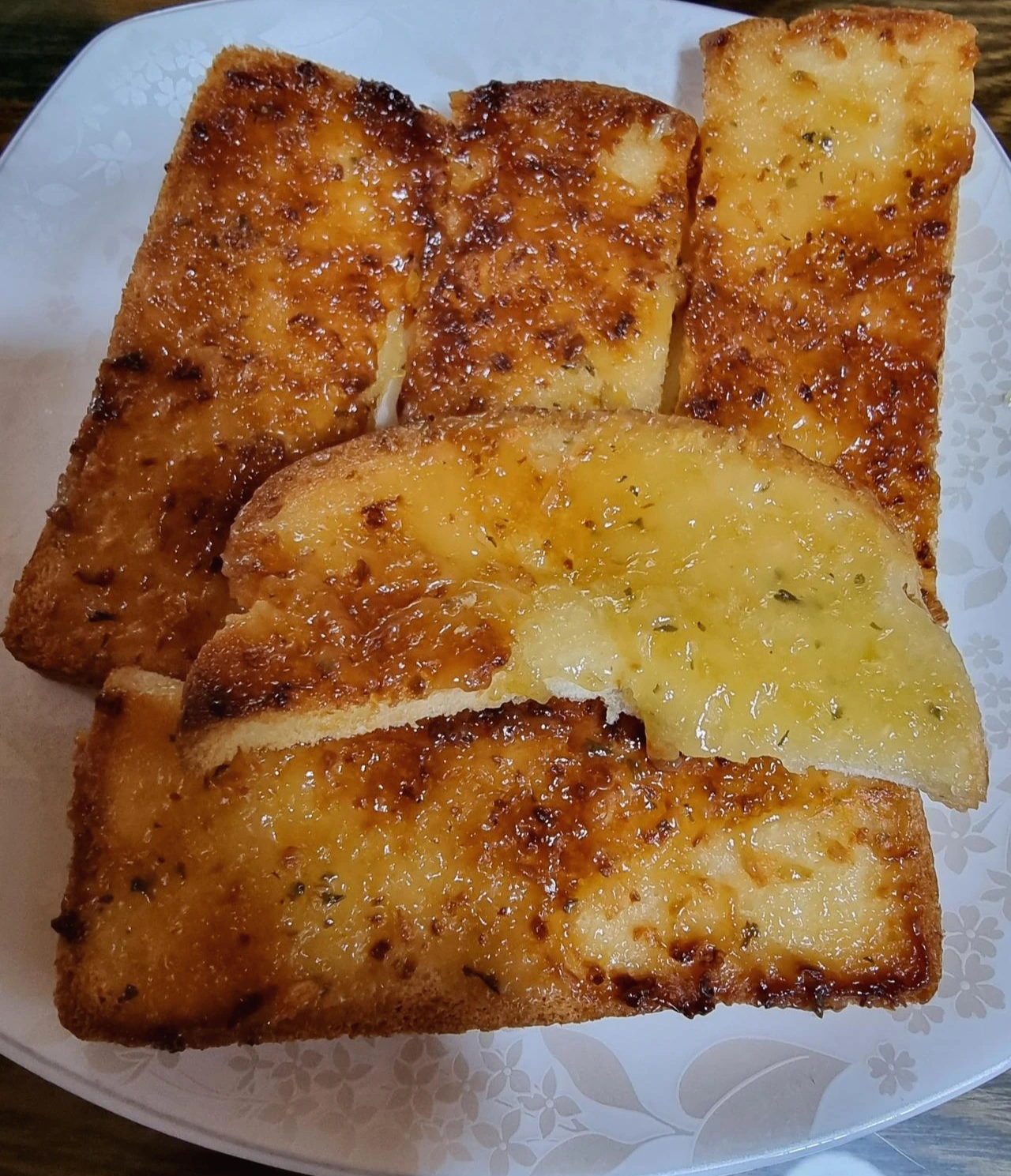 첫 번째 접시에는 버터를 발라 구운 식빵이 먹기 좋게 세모 모양으로 잘려 있었다. 계란물을 묻혀 구워낸 식빵에 설탕을 바른 게 두 번째 접시에 담겨 있었다. 마지막 접시에는 식빵으로 만든 마늘빵이 담겨 있었다. 정말 상상도 못 했다. 에어프라이에서 식빵을 꺼내는 신랑을 보고 의아했는데 생에 처음 만든 마늘빵이고 했다.