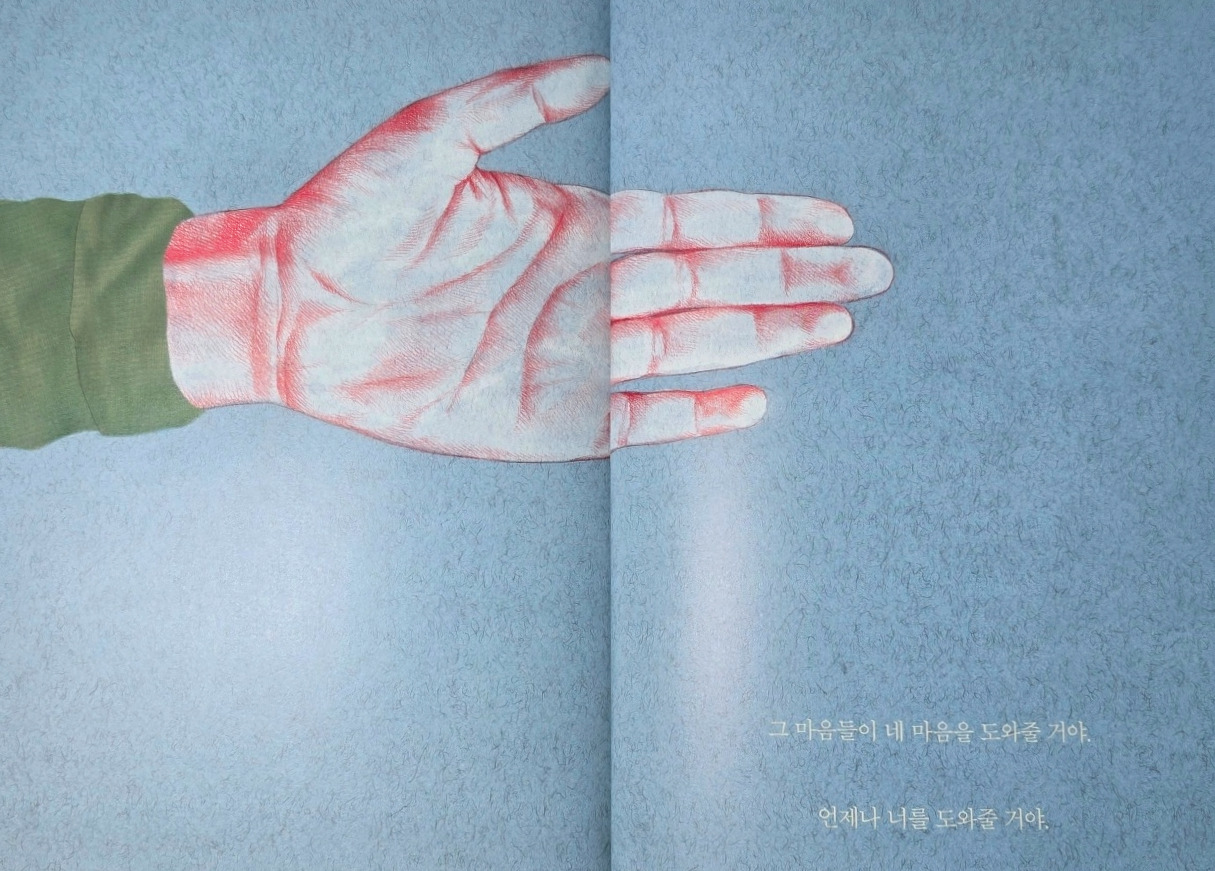 마지막으로 작가는 보이지 않는 마음의 집에서 혼자 괴로워하고 있는 사람들에게 이야기한다. 혼자라고 생각하겠지만 세상에는 도와줄 '다른 마음들'이 있다고 그러니 그 손을 잡으라고 한다. 살짝 분홍빛이 도는 따뜻한 온기가 있을 듯한 손이다. 나에게는 손을 내밀어 줄 누군가가 있을까? 가만히 생각해 본다. 그래도 떠올릴 수 있는 사람이 있어 다행이다. 이 글을 읽게 될 누군가도 떠오르는 사람들이 있기를 바란다. 그리고 나도 마음의 집에서 힘들어 할 누군가에게 따뜻한 손을 내밀어줄 수 있는 사람이 되기를 다짐해 본다.