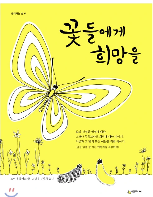 봄이 되면서 아이들을 위한 책들을 정리하다가 트리나 폴러스의 『꽃들에게 희망을』 찾았다. 이 봄에 꼭 맞는 노란색 표지에 커다란 나비가 보이는 앞표지. 그리고 커다란 나비를 고개 들어 보고 있는 두 마리 애벌레. 노란색, 나비, 애벌레 모두 봄을 상징하는 것들이어서 보기만 해도 기분이 설레고 화사해진다. 소파 옆 책장에 살짝 꽂아놓고 아이들이 나와 같은 기분을 느끼길 기대해 본다.