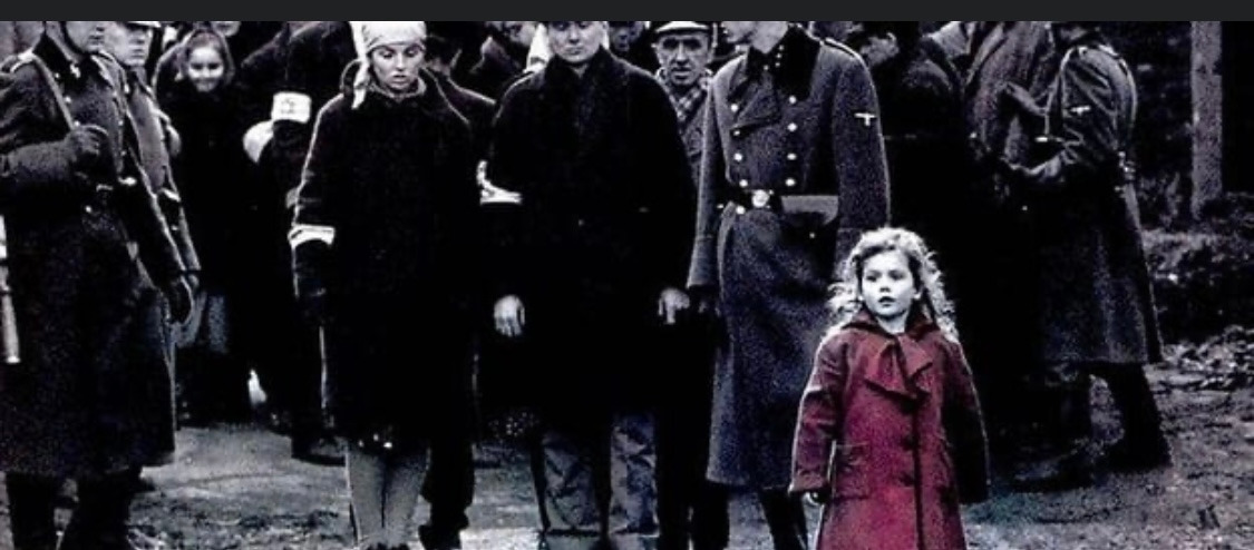 그러나 위의 사진에서 보듯이 카메라 앞에서 연기하는 배우의 영상은 스크린을 가득 채우고 상상의 여백을 없애고 사실적 이미지로 뇌를 도배한다. 그 아래의 영화 사진을 보자. 나치에 압송된 유대인 무리 중 빨간 옷을 입은 소녀의 가련함을 이처럼 사실적인 영화 장면 이상으로 표현할 수 았을까?