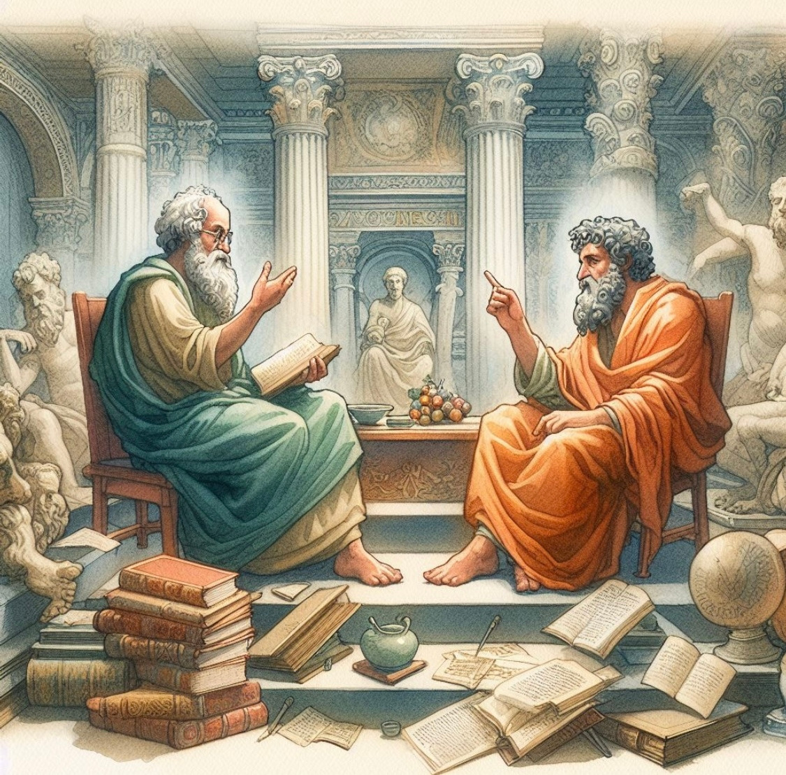 우리는 이 두 사람이 한 걸음 한걸음 끝없이 대립하고 있다고 이해한다. 한 사람(데모크리토스)은 회의론자이고, 다른 한 사람(에피쿠로스)은 독단론자이다. 한 사람(데모크리토스)은 감각적 세계를 주관적 가상으로, 다른 한 사람(에피쿠로스)은 이를 객관적 현상으로 생각한다.