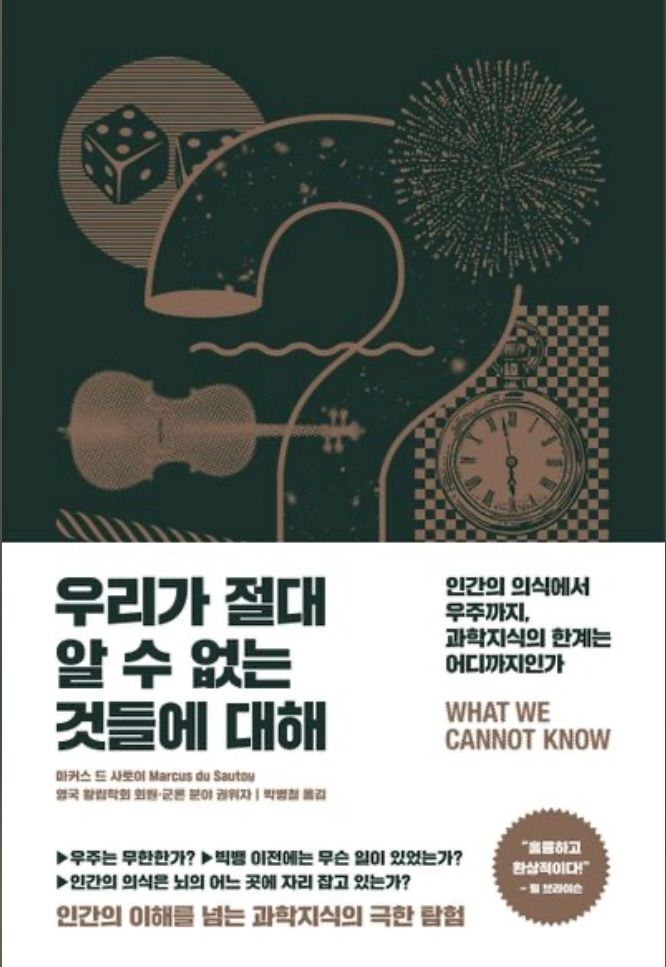 현대 과학의 자료를 못 넣은 주제에 대해서 먼저 말하는 이유는 그것이 너무 중요한 사실이기 때문이다. 신다윈주의자 리처드 도킨스의 후임으로 2008년에 과학대중화사업의 책임자인 시모니 석좌교수로 부임한 옥스퍼드 대학교의 수학자 마커스 드 사토이가 대중들에게 알리고 싶은 내용을 담은 책은 바로 <우리가 절대 알 수 없는 것들에 대해, What we cannot know>이다.