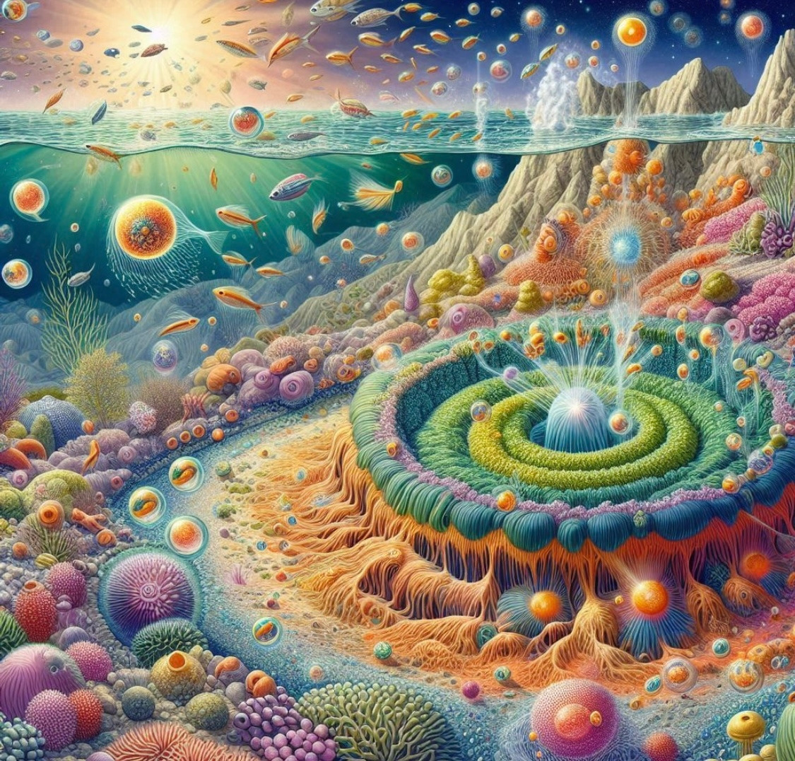 지구의 바다는 생명이 탄생하는 장소가 되었다. 이런 물리학적 설명은 <창세기의 인문학> 3부에서 물리학과 생물학을 통해 간략하게 설명하고 있다. 다시 말하면 지구에 생명이 나타나기 위한 결정적 계기는 달의 형성과 물의 유입이었다. 그리고 생명의 기원에 대해서는 두 가지 유력한 가설이 경쟁하고 있는데, 하나는 내부 발생설이고 다른 하나는 외부 유입설이다.