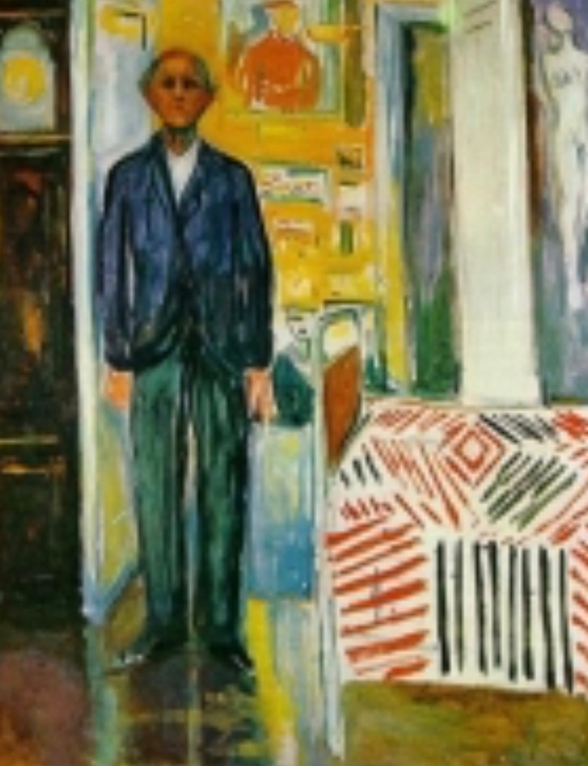 호크니의 이야기를 들어보자. "우리는 종이 위에 선 몇 개만 그려도 거의 모든 것을 나타낼 수 있다는 것을 안다. 그러므로 드로잉을 할 때 <표현 방식의 경제성(economy of means)>이 그토록 중요한 가치를 갖는 것이다... 간소할수록 더 좋다 표현 방식의 경제성은 누구에게나 감동을 준다. 간소할수록 더 좋다." 그러면서 그는 에드바르트 뭉크의 <자화상: 시계와 침대 사이에서>란 작품을 예로 든다. 그러나복제품과 진품의 감상은 너무 차이가 난다는 점도 강조한다.