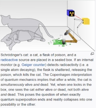 슈뢰딩거 자신은 비결정론적인 양자 역학에 불만을 품었고, 양자 역학이 가진 모순을 드러내기 위해 <슈뢰딩거의 고양이>라는 사고 실험을 제안했으나, 결과적으로 시간이 지난 끝에 본래 의도와는 정반대로 양자 역학을 쉽게 설명하기 위한 사고 실험으로서 이름을 알려버리고 말았다. 슈뢰딩거의 고양이 사고 실험은 어떤 상자 안에 고양이가 있고 계수기와 망치가 연결되어 계수기가 방사선을 감지하면 망치가 상자 안에 있는 병을 깨트려 병 안에 들어있는 독성 물질이 흘러나오며, 이 상자를 열기 전에는 안에 있는 고양이가 살아있는 상태와 죽어있는 상태로 공존하고 있다는 설정이다. 이렇듯 양자 역학은 논리적으로는 모순이지만 결과적으로는 실재하는 미세한 세계(아원자적 미립자)의 구조적 비연속성을 설명하는 원리로 인정되기 시작했다.