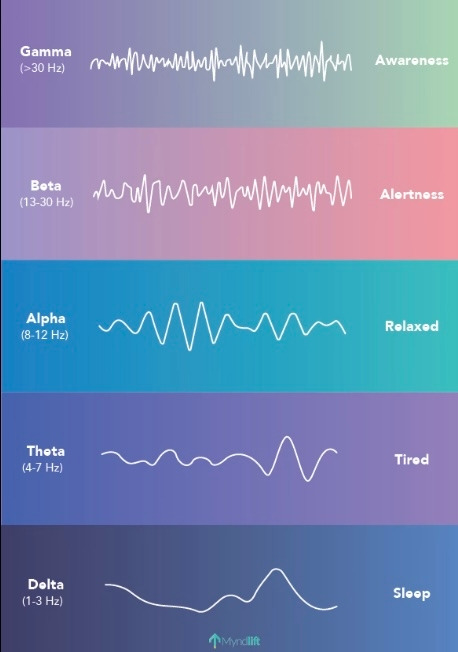 제일 먼저 관측된 뇌파는 8-12 헤르츠로 진동하는 알파파(Alpha wave)였다. 첼로가 낼 수 있는 가장 낮은음이 65 헤르츠임으로 알파파의 진동수는 매우 낮은 편에 속한다. 알파파는 잠들지 않는 편안한 상태일 때 뇌의 뒤쪽에서 발생하며 눈을 감으면 강도가 높아진다. 그 외에 델타파(Delta wave : 주파수 0.5~4Hz. 깊은 수면 상태, 무의식 상태에서 주로 나타나며, 뇌 손상이나 질병과 관련될 수도 있음)와 세타파(Theta wave: 주파수 4~8Hz. 몽롱한 상태, 졸음, 명상 상태에서 주로 나타남)와 베타파 (Beta wave: 주파수 13~30Hz. 집중, 사고, 문제 해결 등 활발한 활동을 할 때 주로 나타남)와 감마파(Gamma wave: 주파수 30Hz 이상. 고차원적인 인지 기능, 정보 처리, 문제 해결 등에 관여)가 있다.