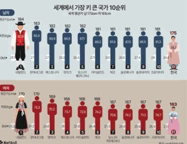 산업화 이전 유럽에서 남성의 평균 신장은 169-171 센티미터였고, 200개국에서 확보한 인류학적 자료를 분석하면, 20세기 들어서 평균적으로 성인 여성은 8.3 센티미터, 성인 남성은 8.8 센티미터가 커졌다. 한국 여성은 평균 신장이 무려 20.2 센티미터나 커지며 20세기 최고의 증가율을 기록했다. 20세기 후반에서 가장 평균적인 신장이 큰 나라는 남성의 경우, 네덜란드, 벨기에, 에스토니아, 덴마크이고 여성의 경우에는 라트비아, 네덜란드, 에스토니아, 체코, 세르비아이다. 여러 조사 결과 어린아이의 키를 가장 쉬운 방법은 더 많은 우유를 마시게 하는 것이다.