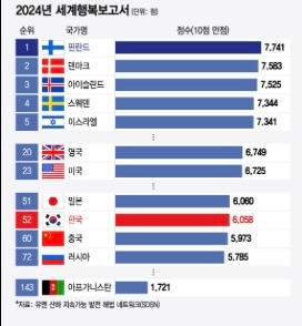 행복 점수는 1인당 GDP, 사회적 지지, 건강한 기대 수명, 관용, 부패에 관한 인식 등 여섯 가지 요인을 기초로 산정한다. 이 보고서에서 한국은 54위, 일본은 58위, 중국은 93위를 차지했다. 우연의 일치로 저자는 바로 그 해 상위 3개국에서 강연할 기회가 있었다고 한다. 그러나 핀란드 사람들이 다른 두 나라 사람들보다 더 행복하다는 것을 전혀 눈치챌 수 없었다. 그래서 그는 이 보고서의 순위가 그렇게 실질적이지 못하다는 결론을 내린다. 게다가 행복과 자살 사이에는 특별한 상관관계가 없다는 사실도 이야기한다. 실제로 행복 점수가 최상위권에 있는 몇몇 국가는 자살률이 상대적으로 높고, 낮은 몇몇 국가에는 자살 빈도가 무척 낮다.
