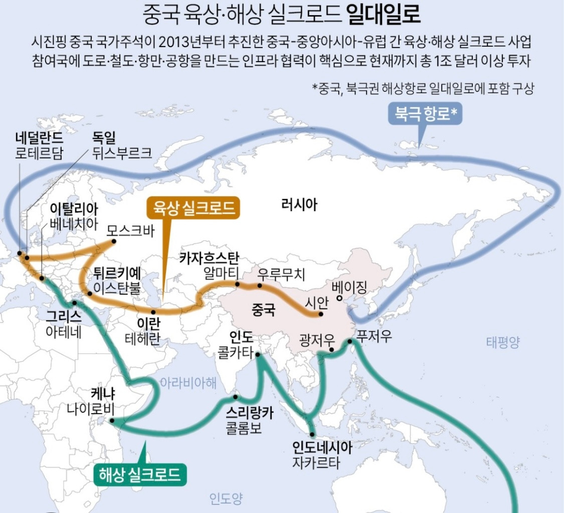 2013년 8월 카자흐스탄에서 발표한 중국의 시진핑 주석의 실크로드 경제벨트의 제안은 소위 일대일로(一带一路, Belt and Road Initiative: 동남아시아·중앙아시아·서아시아·아프리카·유럽을 육해공으로 잇는 인프라·무역-금융-문화 교류의 경제벨트) 정책으로 공표되었다. 이 정책에 들어가는 나라는 155개국이며, 세계 인구의 75프로, 세계 GDP의 절반 이상에 추진 기간도 150년에 달한다. 그러면 다시 원래의 물음으로 돌아가자. '왜 이러한 일이 벌어지고 있나?'라는 질문에 대한 간단한 답변은 '자본축적의 재생산이 이를 요구하기 때문'이라는 것이다.