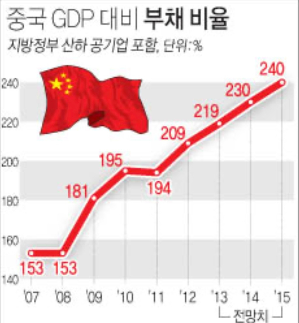 중국의 경우 부채가 높음에도 불구하고 국가부도나 신용위기에 처하지 않았던 이유는 그리스와 달리 달러나 유로가 아니라 런민비(위안화)로 빛을 졌다. 중국의 중앙은행은 외환 보유고가 넉넉하며 자국의 화폐를 임의로 찍어낼 수 있었다. 중국은 신자유주의 정책으로 자국의 경제를 견인했던 레이건처럼 적자와 부채는 문제가 아니라는 견해를 받아들였다. 그러나 2014년경 대부분의 지방행정 당국은 파산했고, 비수익프로젝트에 대한 은행대출의 총체적 과잉 확대를 감추기 위해 유사금융체계가 성장했으며, 부동산시장은 사실상 투기적 폭발성을 가진 카지노장이 되었다.
