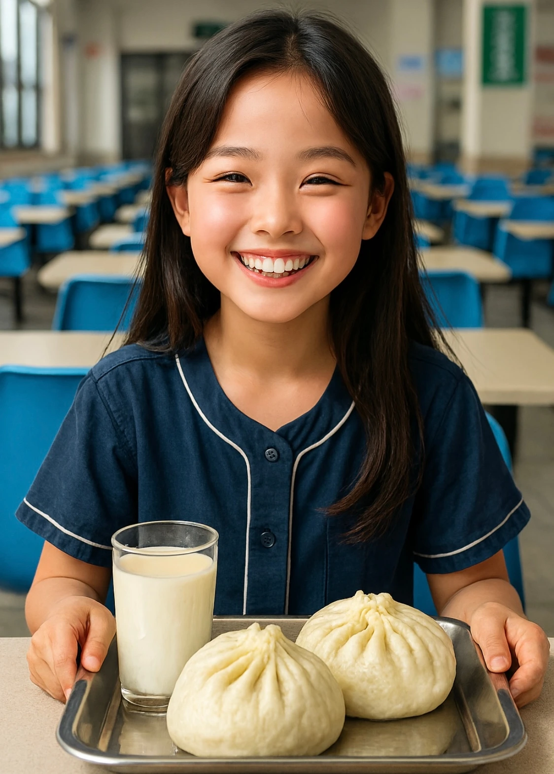기숙사에서는 벽에 달린 에어컨에서 나오는 미약한 온풍으로 추위를 이기자니 그것은 정말 힘들었다. 그러나 그다음 날 아침에 학생들의 은사인 젊은 교수가 산 교내식당의 조식은 우리 아이를 깜짝 놀라게 하였다. 그 교수는 엄청나게 큰 부피를 가진 찐만두들이 가득 찬 큰 대나무 쟁반을 몸소 들고 왔는데, 만두 하나의 크기가 두 손을 모은 것보다 더 컸다. 이어서 학생들이 500 미리 정도의 따뜻한 두유 팩을 하나씩 나누어주었다. 아이는 자기 얼굴만큼 큰 만두와 두유를 보고 잎이 딱 벌어졌는데, 그 순간을 찍은 사진에서는 아이의 놀란 얼굴이 아직도 이층 계단에서 환하게 빛나고 있다.