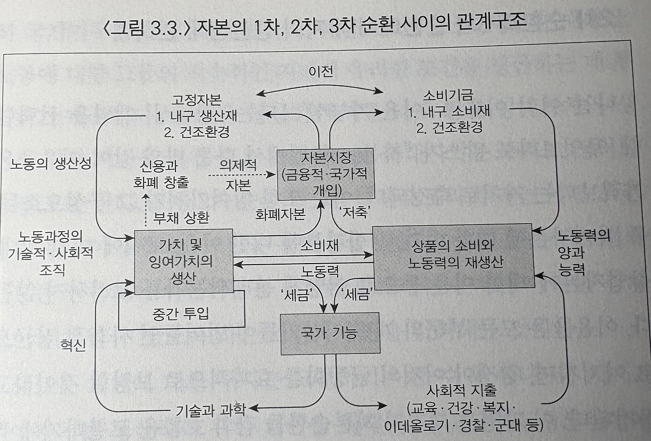 이제 마지막으로 3차 순환(금융 순환)과 이로 인한 자본순환 전체의 모순구조를 살펴보자. 3차 순환은 우선 과학과 기술에 대한 투자 그리고 노동력의 재생산과 연관되는 광범위한 사회적 지출로 구성된다. 후자는 다시 두 가지 유형의 투자로 구분되는 데, 하나는 자본의 관점에서 노동력의 질적 개선을 위한 투자(노동자의 능력이 향상되도록 하는 교육과 보건에 대한 투자)이고, 다른 하나는 이데올로기적, 군사적 여타 수단으로 노동력을 흡수, 통합, 억제하는 데 치러야 하는 투자이다. 저자는 처음에는 자본과 노동 간의 표면적으로 드러난 계급투쟁이 없는 것으로 가정한다. 그럼으로써 개별 자본가들과 자본 일반 간 모순이 축척과정 내에서 불안정의 주요 근원이라는 점을 이해할 수 있다고 한다. 저자는 이 장에서 어쩔 수 없이 도시과정에 대한 서술은 생략했다고 말한다. 그래도 일반 독자에겐 무척 어렵다. 그가 제시한 도식을 보면 좀 더 명확하게 이해할 수 있을 것이다. 아래를 참조하기 바란다.