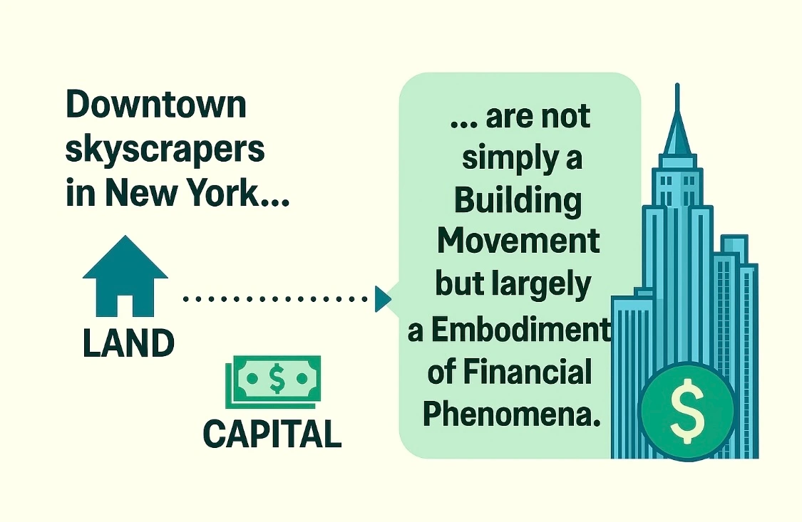 다시 세계로 눈을 돌려보자. 저자는 1973년 이후 수백 번의 금융위기가 있었고( 그 이전에는 거의 없었다는 점과 비교해 보라) 이 가운데 상당수는 부동산 개발 혹은 도시개발이 주도했다고 진단한다. 이 개발의 과정 이면에는 '비합리성의 충만' 그리고 금융가들의 '동물적 충동'은 걷잡을 수가 없었다고 한다. 미국의 국가경제연구국은 비교적 최근까지의 미국에 일어난 부동산 붐이 자본주의의 심각한 위기를 유발한다는 또 다른 사례를 발굴했다. 괴츠만과 뉴먼이 뉴욕의 고층빌딩 건설에 관한 자료를 수집해 만든 그래프를 보면 1929년, 1973년, 1987년, 2000년 붕괴에 앞선 부동산 붐은 첨탑처럼 치솟아있다. 그러므로 저자는 뉴욕의 고층빌딩들은 '단순한 건축운동 이상이며, 주로 광범위한 금융현상을 구현한 것이라고 할 수 있다'라고 한다.