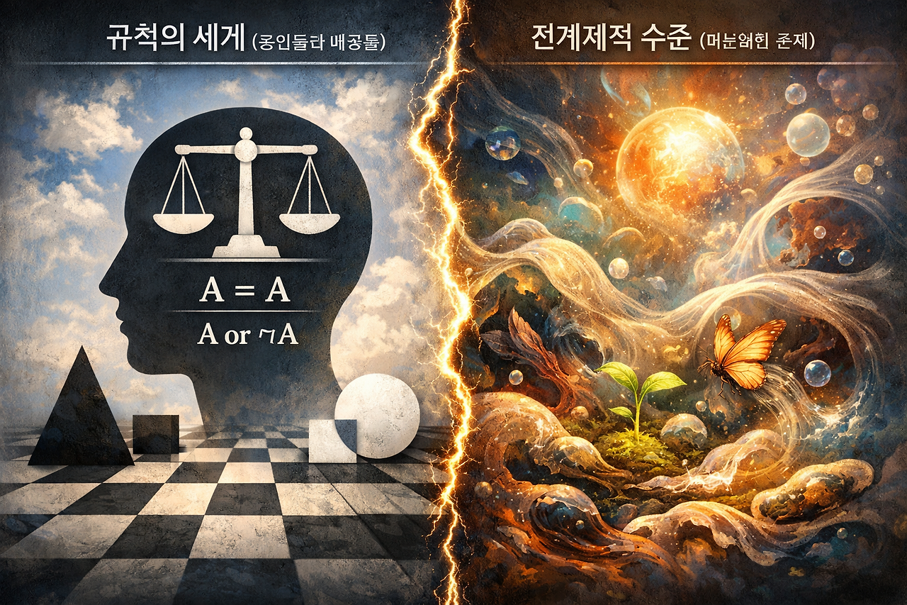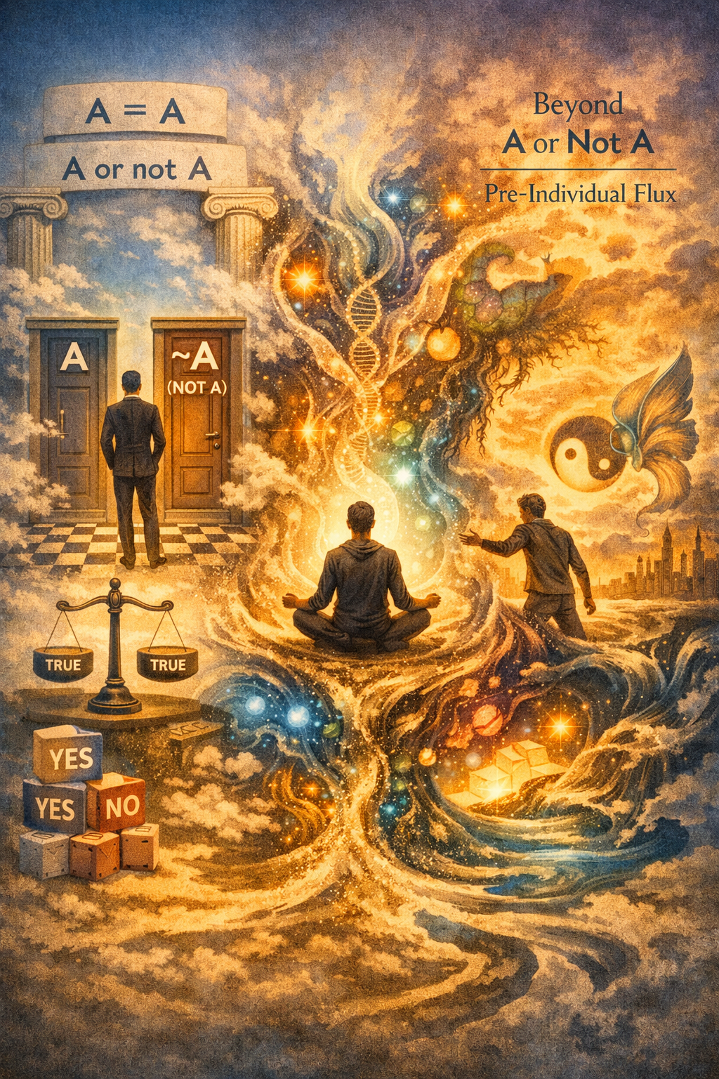 인간의 지성은 사물을 인식할 때 사유의 논리적 규칙에 감각을 통해 뇌에 들어온 감각자료들을 처리한다. 예를 들어 정원에 자라는 식물들을 관찰할 때 장미와 튤립을 인지하고 구분하는 사고 작용의 배후에 동일률(A=A: 장미는 장미이다)과 배중률(A ∨ ¬A: 장미는 장미이거나 장미아니거나 그 둘 중 하나이다)이 있다. 아이는 엄마를 매일 접하면서 어제의 엄마와 오늘의 엄마가 동일한 사람이라는 것을 동일률에 이해 확인한다. 어제의 엄마와 오늘의 엄마와 동일한 이유는 곧 그 엄마는 엄마이거나 엄마 아니거나 둘 중 하나이기 때문이다. 이렇듯 인간의 사고 이면에 존재하는 기본적인 규칙이 바로 동일률과 배중률이다. 그러나 시몽동은 전개체적 수준의 존재에서는 이 규칙이 적용되지 않는다고 한다. 이 말은 과연 무슨 뜻일까?