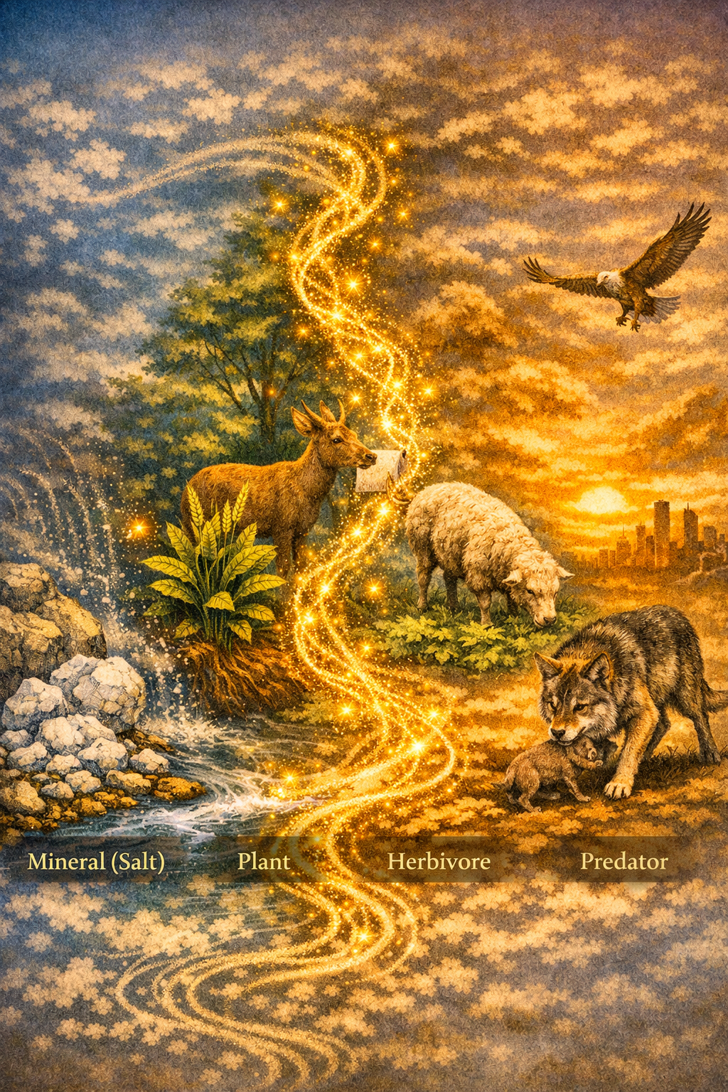 예를 들어 무기물인 소금이 어떻게 생명의 순환 속으로 들어가고 변환(transduction)되는 과정을 추적해 보자. 광물(소금) → 식물 → 초식동물 → 포식자로 이어지는 과정에서 물질은 단순하게 이동하는 것이 아니라 생명 구조 속에서 새로운 기능으로 조직되는 과정으로 나타난다. 자연(바다, 토양, 암염층, 염전)에서 소금은 단순한 무기 이온 Na⁺ Cl⁻의 상태이다. 식물은 뿌리를 통해 토양 속 이온(Na⁺ K⁺ Cl⁻)을 흡수하고 이 이온들은 식물 세포 안으로 들어가 삼투압과 전기적 균형을 형성한다. 무기 이온이 생명 조절 메커니즘으로 조직되는 것이다. 이것이 물질의 생명적 변환이다. 초식동물은 식물을 먹거나 염분이 있는 흙, 암염, 염천을 핥아서 소금을 간접 섭취한다.