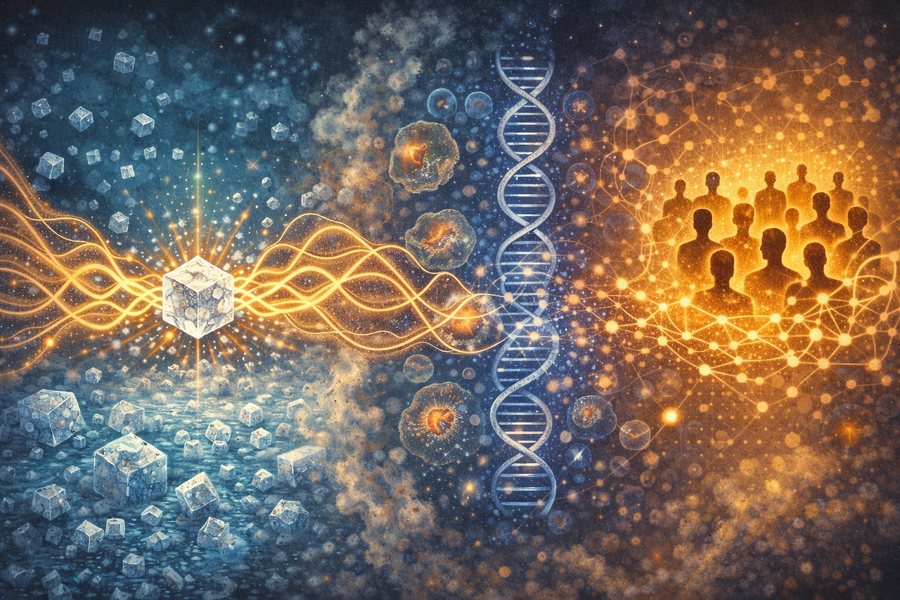이제 사건에서 공명으로 시선을 돌리자. 공명은 정보의 사건이 발생하는 체계의 내적 과정으로 볼 수 있다. 물질 층위에서 공명은 구조 변화가 매질 전체로 전달되는 과정이다. 여기서는 국소적 변화가 전체로 확산되어 시스템 내부에서 상호 반응 발생하는 현상이 나타난다. 앞에서 수 차례 예를 들었듯이 소금 결정의 과정은 과포화 용액 존재에서 작은 결정 씨앗 등장하고 그 이후 결정 구조가 주변으로 확산된다. 여기서 씨앗이 정보의 계기라면 확산 과정이 바로 공명이다. 이 구조는 물질 층위에서 끝나지 않고 같은 메커니즘이 생명과 정신 그리고 집단으로 확장된다. 생명의 층위에서 정보가 유전 및 환경 신호라면 공명은 세포의 네트워크 반응으로 볼 수 있다.