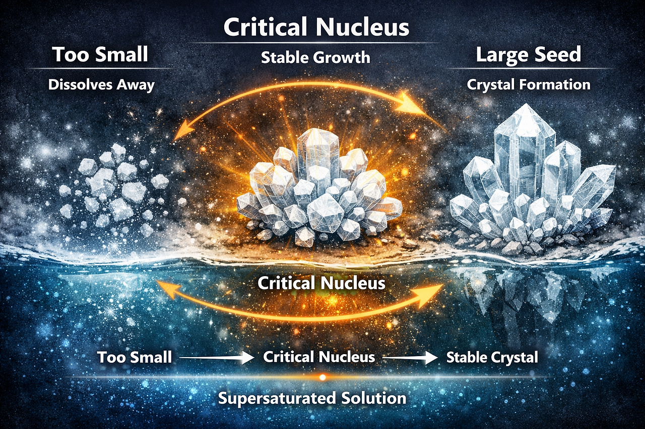 타만은 물리화학자이면서 동시에 금속학과 재료과학(소재과학)의 분야에서 큰 기여를 한 학자이다. 특히 그는 금속과 용액에서 결정이 어떻게 생성되고 성장하는가를 체계적으로 연구하였다. 즉 그의 연구 주제는 '왜 어떤 조건에서 갑자기 결정이 생기기 시작하는가?'라는 것이었다. 우리가 이미 시몽동의 개체화 과정에서 알아본 것처럼 타만 역시 과포화(supersaturation) 상태에서 결정 형성이 생기는 잠재적 경향성이 있다는 사실을 발견하였다. 그가 관찰한 결과 결정이 생기는 계기는 핵 생성(nucleus formation)에서 결정핵 (crystal nucleus)으로 넘어가는 패턴을 발견한 것이다. 예를 들어 소금 용액의 경우 과포화 상태의 용액에서 아주 작은 소금의 결정 씨앗이 형성된다. 그러나 이것이 너무 작으면 녹아버리고 일정 크기를 넘으면 안정 상태에서 다른 결정 구조를 형성하는 핵이 된다. 이 중간을 그는 임계핵(critical nucleus)이라고 부른다.
