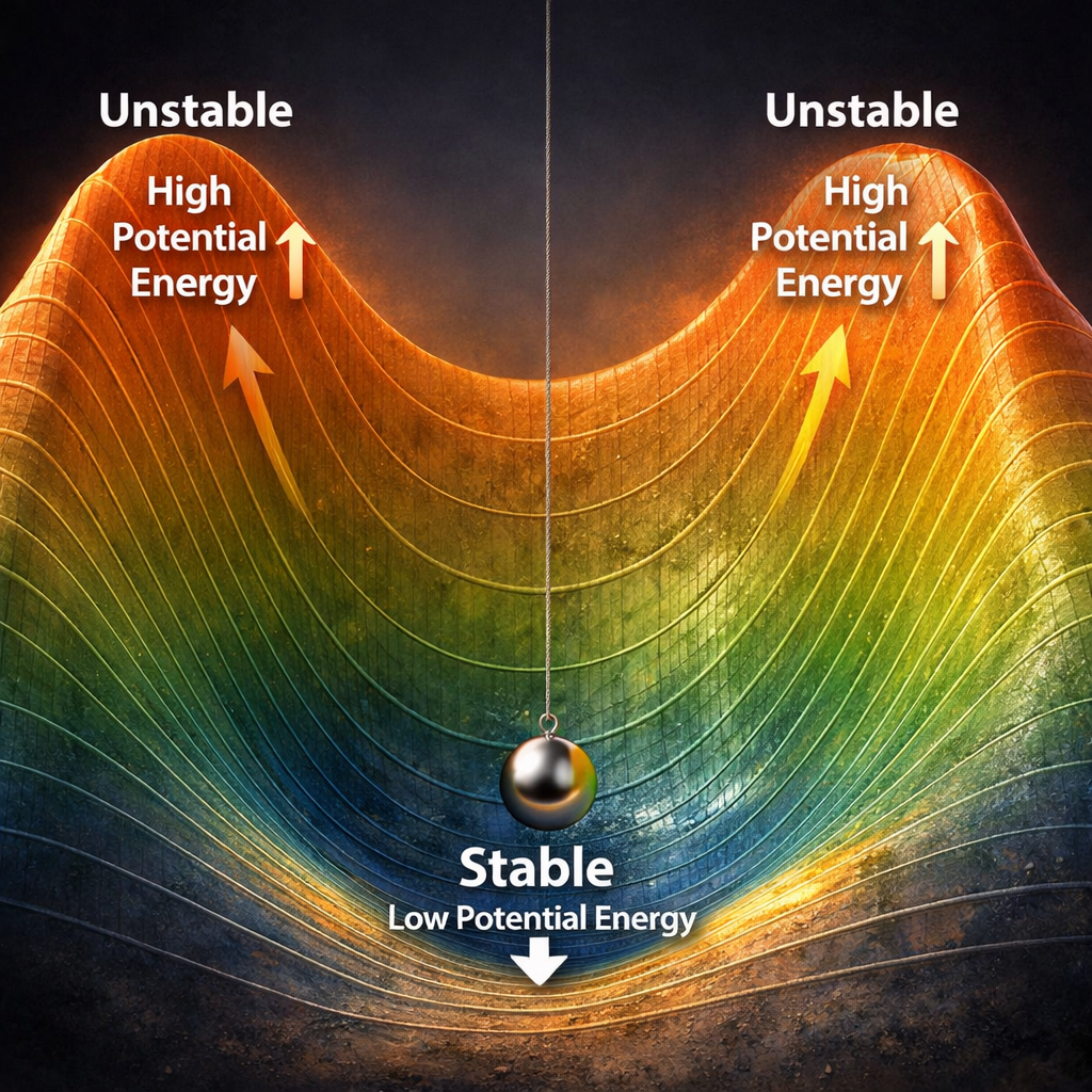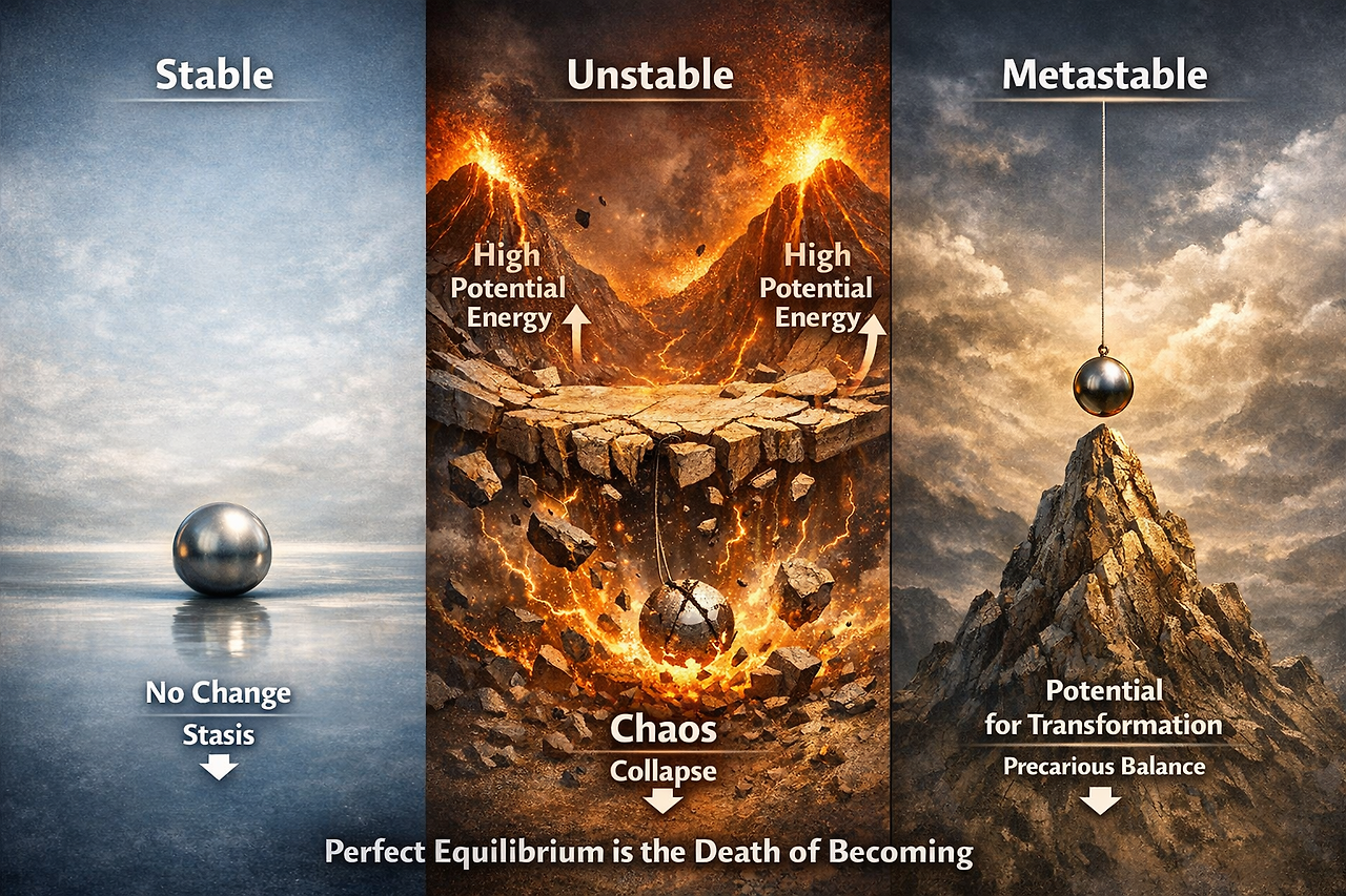 다시 물리학적 현상으로 이 개체화 과정을 간략하게 배치하면 1) 안정적 평형 (Stable Equilibrium): 최저 에너지 상태, 교란에 저항하고 원래 상태로 돌아옴, 변화 불가능, 개체화 불가능 2) 불안정적 평형 (Unstable Equilibrium): 최고 에너지 상태, 작은 교란에도 붕괴, 지속 불가능 3) 준안정적 평형 (Metastable Equilibrium): 최저가 아닌 에너지 상태, 안정해 보이지만 더 낮은 에너지 상태로 전이할 잠재성을 품고 있으며 개체화의 진짜 조건이 된다. 그렇다면 준안정성이 왜 중요한가? 그 이유는 시몽동이 보기에 완전히 안정된 시스템은 변화하지 않으며, 완전히 불안정한 시스템은 지속되지 않고 단지 준안정 상태만이 변환의 잠재성을 품기 때문이다. “개체화는 준안정적 평형 상태에서만 일어날 수 있다. 완전한 평형은 존재의 죽음이다.”