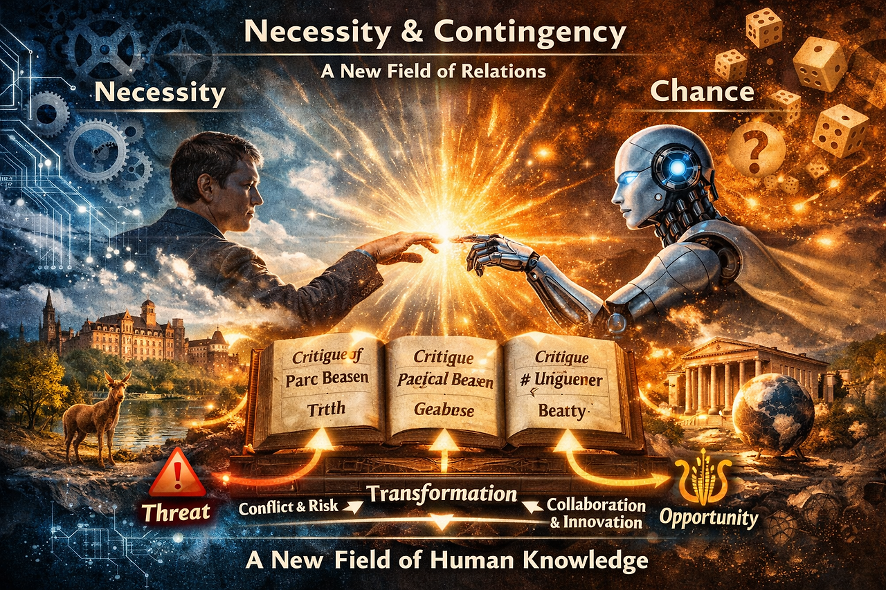 이제 이 말은 프리고진과 타만의 이론과 더불어 연결하면 훨씬 설득력이 있게 독자들에게 들릴 것이다. 잠재성에서 현실성으로 그리고 그 현실성이 개체로 다시 그 개체가 잠재성으로 돌아가는 자연의 순환은 단순히 반복적 순환은 아니다. 행성의 주기는 일정하지만 단순한 반복이 아니라 팽창하는 우주와 그 공간의 밀도를 균등하게 유지하는 암흑에너지 그리고 가장 중요한 것은 그러한 물리적 변화에서 지구상에 나타난 생명의 생성이 연결되어 있으며 앞으로 어떤 것들이 새롭게 생성될지는 수학적으로 예측할 수 있는 것만은 아니다. 발견은 필연이지만 그러나 생성은 필연 가운데 나타난 우연이고 이 필연과 우연이 만나서 새로운 관계의 장을 형성한다. AI가 나타난 것은 컴퓨터의 등장 이후 예견된 것이지만 이렇게 빠르게 인간과 상호작용하면서 때론 위협적인 도구로서 때론 충실한 조력자로서 생성될 줄 예상한 사람은 거의 없었다.
