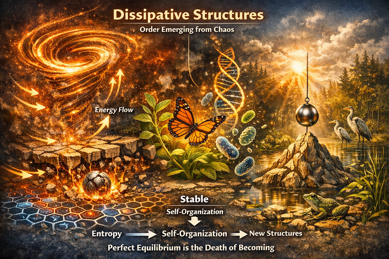 가장 먼저 발견된 열역학 제2 법칙은 엔트로피 증가의 법칙이다. 열은 저절로 차가운 곳에서 뜨거운 곳으로 이동하지 않는다. 그리고 엔트로피(에너지가 더 이상 일을 할 수 없게 퍼진 정도, 에너지가 얼마나 균등하게 분산되었는가를 나타내는 물리량: 무질서로도 번역)는 열의 역학의 원리에서 사용한 만큼 증가한다. 고립계의 엔트로피는 항상 증가한다. 질서에서 무질서로. 그렇다면 형태(질서)는 어떻게 생겨나는가? 일리야 프리고진은 엔트로피의 증가에도 불구하고 자연은 왜 질서와 구조를 계속 만들어내는가? 하는 근본 물음을 던졌다. 왜냐하면 열역학 제2법칙과 모순되는 것과 같은 생명과 소용돌이 그리고 화학적 패턴과 생태계에서 이런 현상이 지속적으로 재현되기 때문이다. 그 결과 그는 소산 구조 (dissipative structure: 에너지 흐름이 있을 때 질서가 스스로 생성되는 구조)의 원리를 발견하였다.