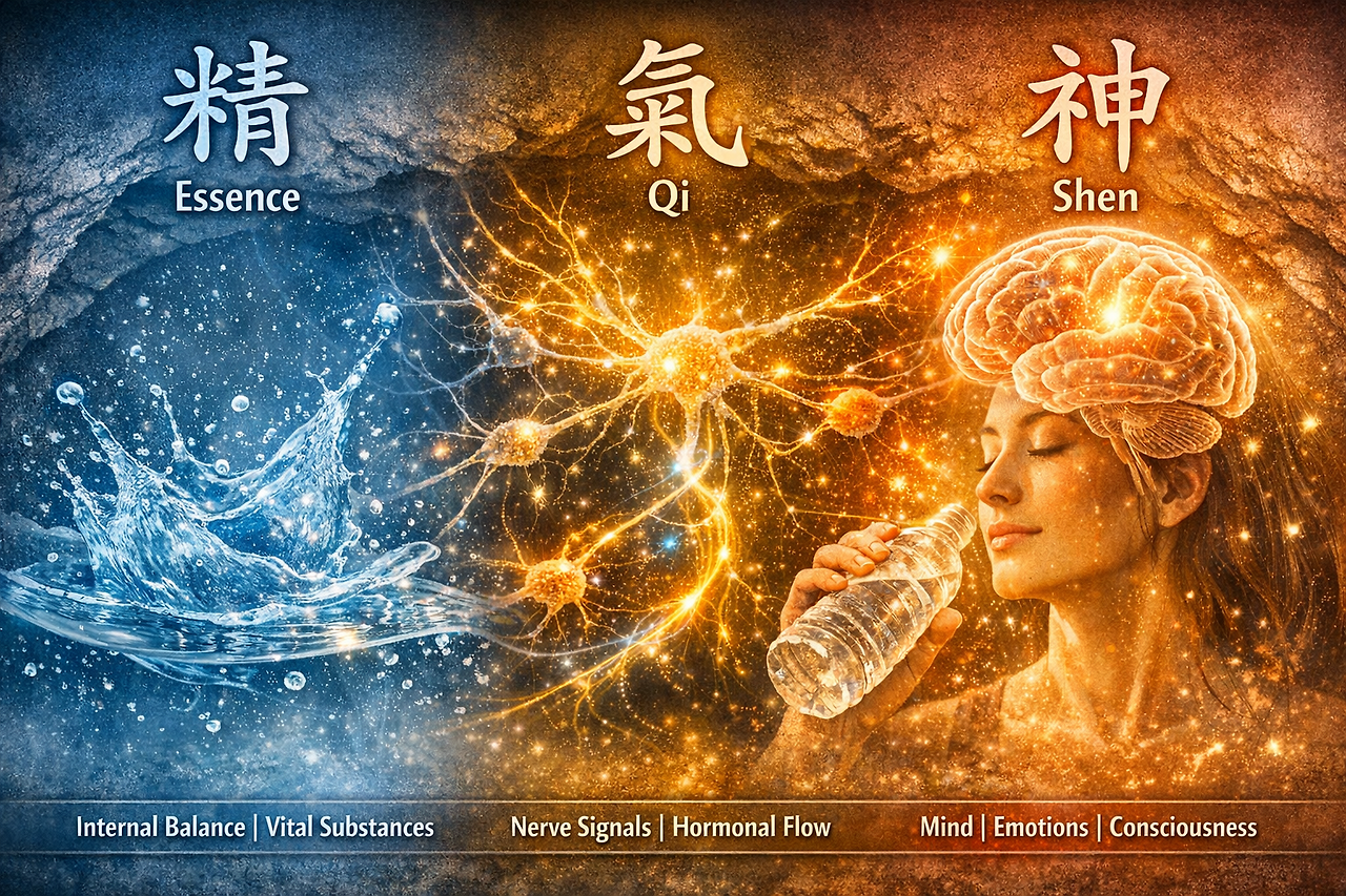 동아시아권의 문화와 약간 흥미로운 대비를 해보자. 동아시아 의학에서는 인간의 몸을 정(精: 물질적 기반으로서 체액, 영양, 호르몬)과 기(氣: 흐름과 기능으로서 피와 공기의 순환에서 통로로서 일종의 신경 신호, 신진대사)와 신(神: 감정과 의식과 인지 기능이 통합된 상태)으로 구분한다. 이를 서구의 신경과학과 대비하면, 정은 내부환경(체액, 항상성 기반)으로 그리고 기는 신경·호르몬 조절 흐름으로 신은 뇌 활동, 의식, 감정으로 대비할 수 있다. 그리고 이 세 가지 요소가 조화를 이루어야 건강한 심신을 유지한다. 즉 精氣神一也(정기신일야: 정기신은 하나이다, 하나로 연결되어 있기) 때문이다.