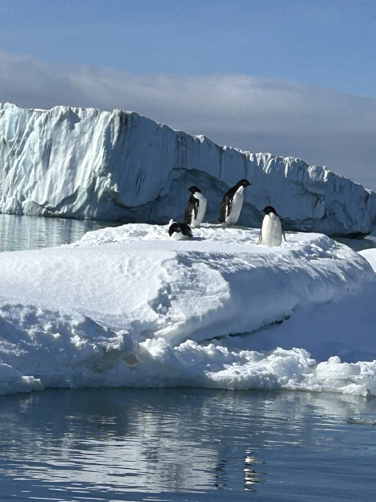 바다 한 가운데의 유빙에서 쉬고 있는 아델리 펭귄들