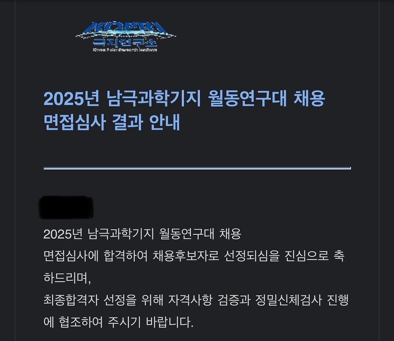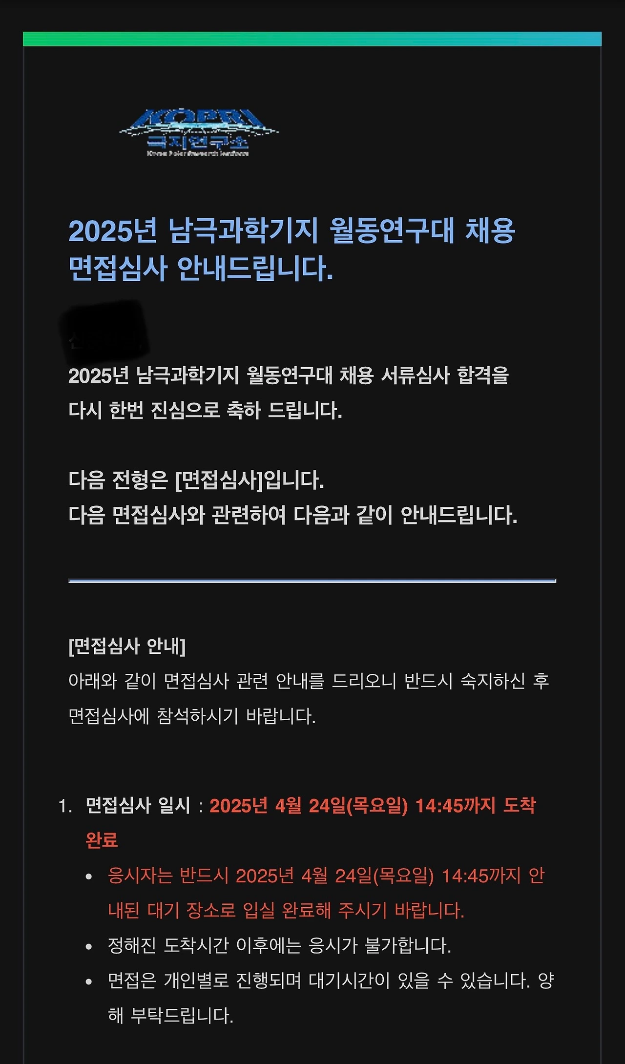 2025년 3월 17일 서류접수를 완료하여 4월 8일 서류합격 연락을 받았다. 워낙 뛰어난 지원자가 많을 것 같아 큰 기대를 하고 있지 않았는데, 일단 1차 합격 소식을 받으니 기뻤다. 다음 전형은 온라인 인성검사 및 면접전형이다. 날짜 통보를 받고 참석여부를 결정한 후 4월 14일까지 온라인 인성검사를 완료해야 했다. 인성검사는 약 30분이 소요되는 간단한 절차였다. 4월 15일에 연구소에서 다시 연락이 왔다. 면접심사는 2025년 4월 24일 목요일 오후 3시 이후에 인천 송도의 극지연구소에서 잡혔다. 당일 2시 45분까지 신분증과 학위증명서 사본을 가지고 도착하면 된다고 했다.